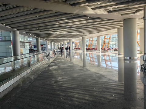 T1航站楼是一个弯曲的长条候机长廊,分布着数个候机厅,从长廊两端向中心大约三分之一处,各有一个与其垂直的候机长廊,形成两个T字形。两个T字形中心的楼上(4楼)各设一个中转休息区,转机旅客可在此休息。