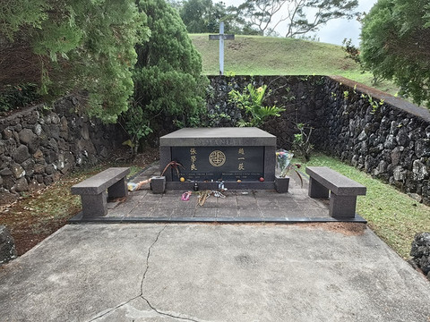 沿公路行驶,大约九点半,看见Valley of the Temples的牌子,左转开入小路之后,朝着大山开去,道路起起伏伏,两旁是大片齐整的草坪,上面点缀着簇簇鲜花,这就是墓,墓碑都镶嵌在草地上。大约行驶六七百米,左侧坡上可看见张学良赵一荻墓,墓前,有鲜花,还有一瓶汾酒,回去一查2001年10月14日是去世日期,今天是10月20日,有人曾前来祭拜。再行驶三四百米到达平等院停车场。门票,每人5美元。当时告诉三人,只收了10美元,一问,回答说进去吧,一副我说了算的样子。