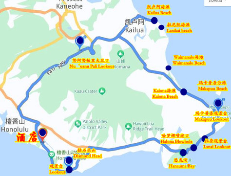 酒店—平等院The Byodo-In Temple—古兰尼牧场Kualoa Regional Park—拉耶点Laie Point State Wayside—卡胡库Kahuku—海龟湾Turtle Bay Resort—日落海滩Sunset Beach—鲨鱼湾Sharks Cove—威美亚湾海滩公园Waimea Bay Beach Park—拉尼亚克雅海滩Laniakea Beach—哈雷瓦镇Haleiwa—都乐种植园Dole Plantation——酒店