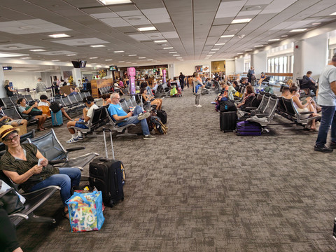 前往值机柜台办理行李托运手续,排队时服务人员给一张表,填写入美国后住址、联系人、电话等信息(这是美国CDC疾病控制和预防中心要求的,也许以后会取消),填好后交给值机柜台人员办理,打印了两个航段登机牌,确认行李直挂火奴鲁鲁。