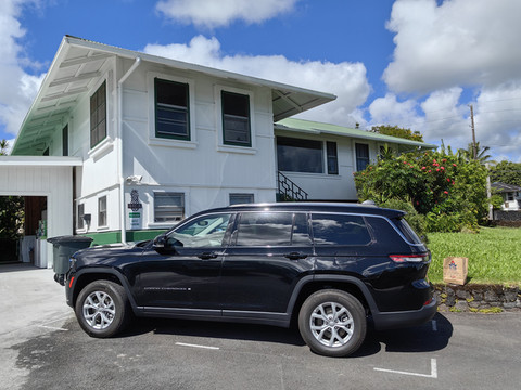 出示有关材料后,给了汽车钥匙,车辆就在柜台后面停车场里。前文说过,给了一辆七人座JEEP,车很新,才行驶了1382英里,约2211公里。车虽然大,但很好开,有倒车影像。增加驾驶员和低龄驾驶员(25岁以下)3天费用47.12美元。问清还车地点(原地)后,去民宿办理入住。
