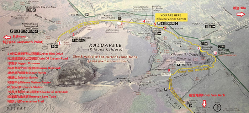 火山公园分为两条路线,一条是环绕火山口的环形路线(Crater Rim Drive),这条环路的西面和南面已被熔岩损毁;另一条是直达海边的火山口链路(Chain of Craters Road)。每一条路均设有很多个观景台,适合拍照留念。