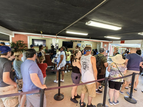 迎面一排房子中间有个门洞,门洞左手窗口是亚利桑那号战舰纪念馆(The USS Arizona Memorial)解说购买处,是否是门票领取处就不知道了。获取免费门票的方式有两种,一是提前在网上预约然后凭预约到现场领票,可预约的时间段有两个,两个月以后的或者第二天的,网上预约需要收取每张1.5刀的手续费;二是游览当天到现场领票免手续费。每天只发1300 张票,有可能遇到票已经发完的情况,而且从当地时间早上7点就开始发放,先到先得。