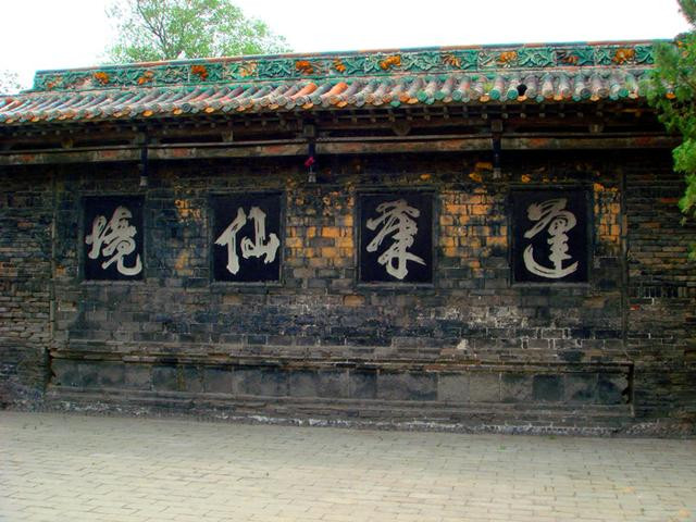 八仙阁前南侧影壁上镶嵌着“蓬莱仙境”四个草书石刻,笔势飞舞,苍劲有力,颇具神话色彩,传为得仙后的吕洞宾之手书。影壁对面向中轴建筑群的丹门,上原有明嘉靖皇帝朱厚熄题匾“风雷隆一仙宫”。