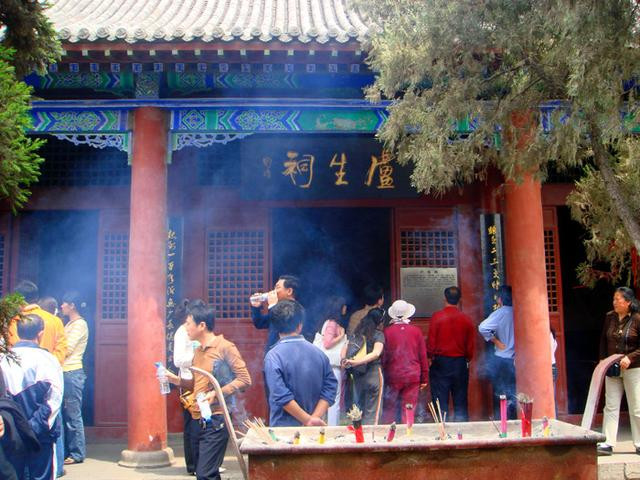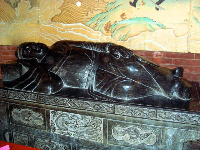 从吕祖殿绕暖阁出后门,便是吕仙超度晤世的卢生殿,卢生本为唐传奇《枕中记》(沈既济撰)人物,卢英,字粹之。殿内有青石雕就的卢生睡像,长约5尺,一手托腮,一手安然置于胯上,头西脚东,侧身而卧,两腿微曲,睡意朦胧,正在做他的黄粱美梦,睡像维妙维肖。