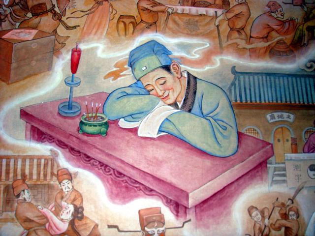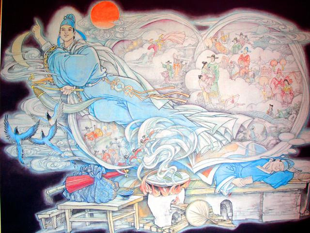 《枕中记》记载:唐开元七年,青年卢生赴京赶考,途中住在邯郸北面一小客店,遇道士吕翁,授其青瓷枕,遂入梦境。梦中娶妻名门,飞黄腾达,出将入相,五子登科,享尽人间富贵,八十多岁善终。一觉醒来,悟破人间真谛,见店主人蒸的黄梁米饭还未熟。