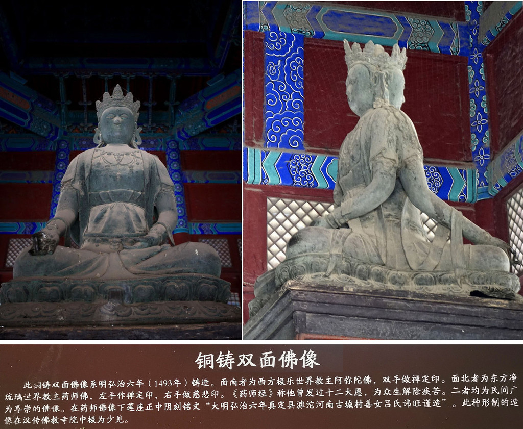 “大悲阁”内供奉“千手千眼观音”。各臂分持日月、净瓶、宝塔、金刚、宝剑等,可惜两侧40双铜手臂均被毁,已改为木制,仅前胸两臂为原铸。