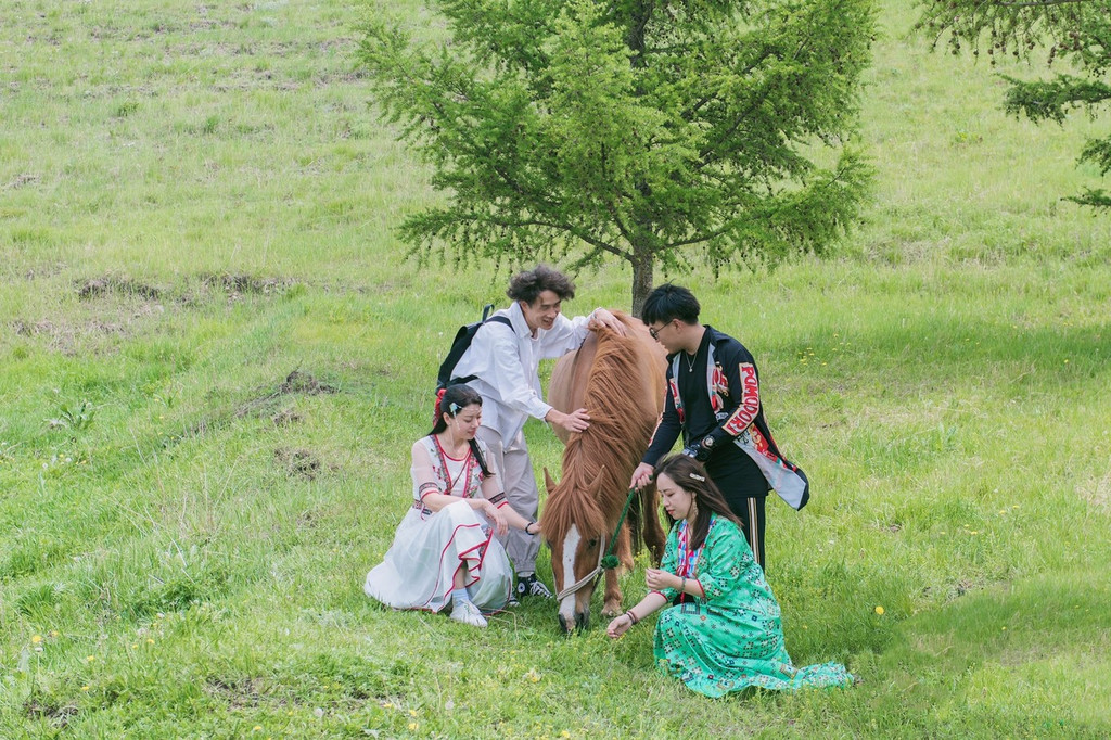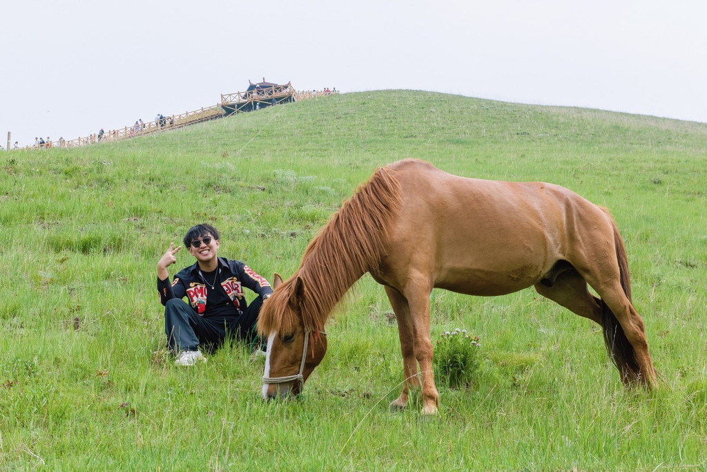 马儿在草地上悠闲地吃草,当我们靠近时也丝毫不畏惧,它们早已把人们当成最好的伙伴。马儿棕色的毛发随风摆动,比草儿柔顺,似流水轻滑,我们也和马儿们亲密无间,一起留下了此行珍贵的合影。