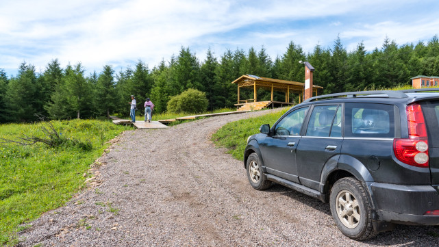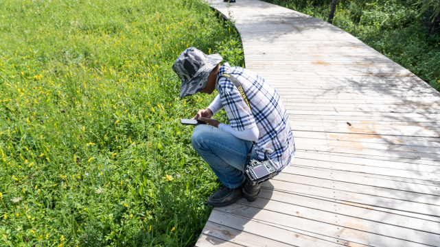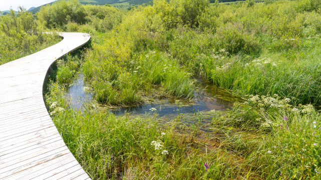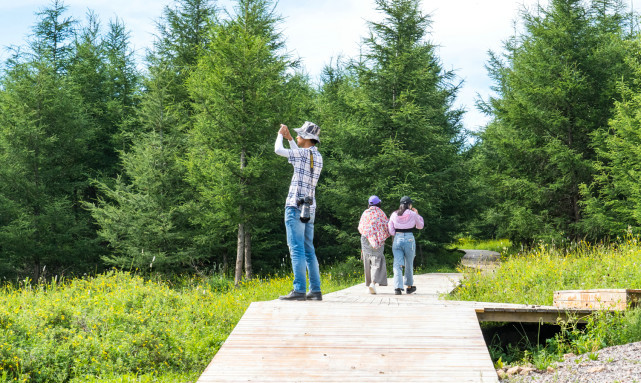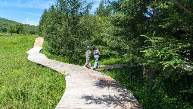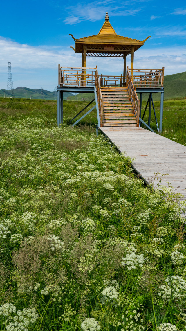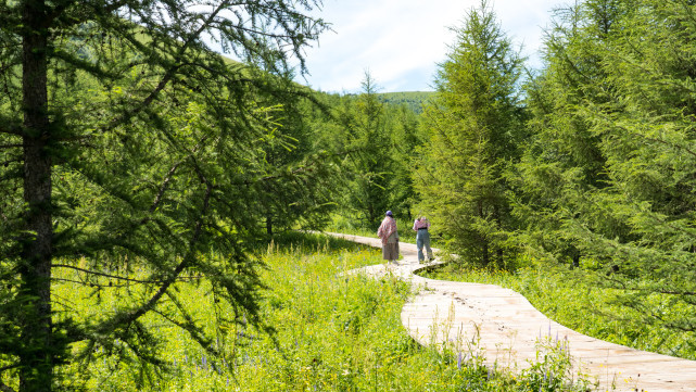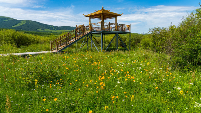 金莲湖位于千松坝森林公园进口处,因为湿地里有非常多的金莲花而得名。这里有连片的灌木金莲花海,晶莹剔透的湿地湖泊,还有一条木栈道穿梭其间,有一处为游客打造的登高望远观景台。