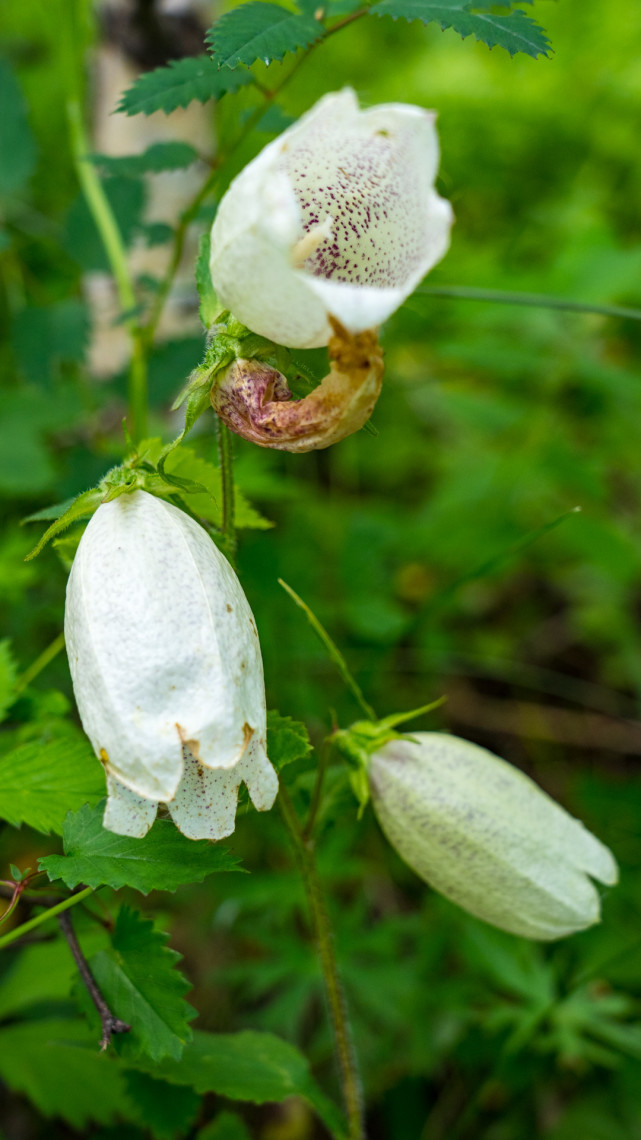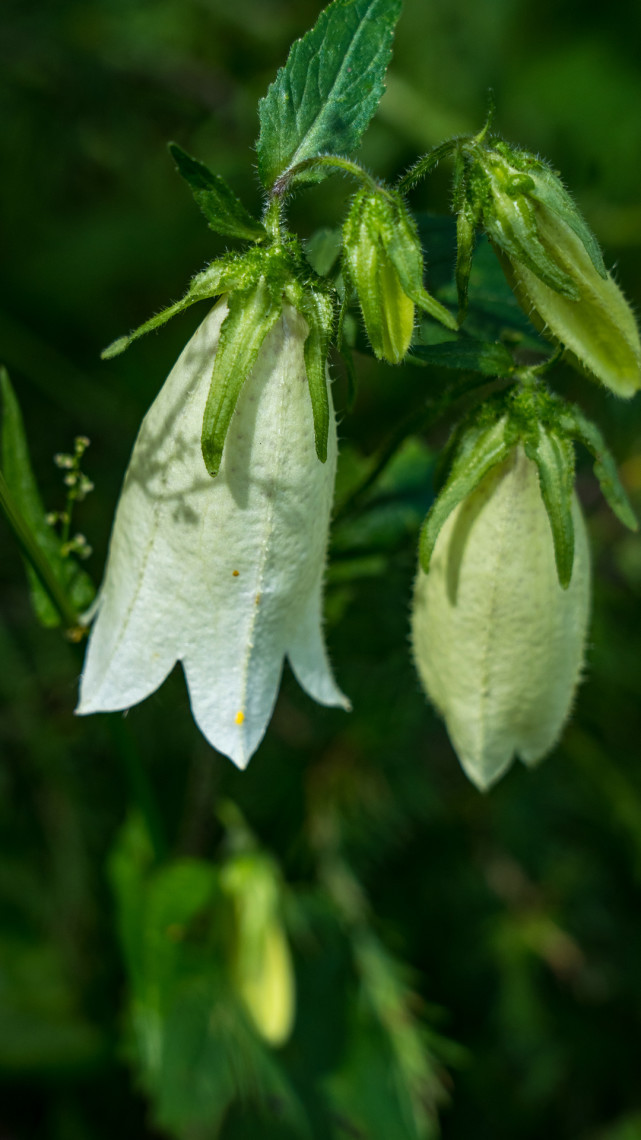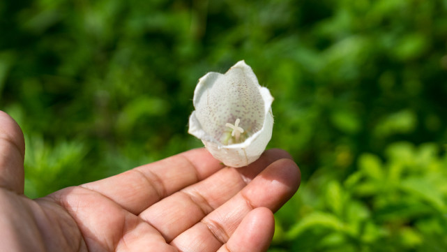 紫斑风铃草花冠白色,半球状倒锥形,像一个倒挂金钟,常生长于海拔2000米的高原地带。它外表白色,为何还有个紫斑的名称,看它的花芯你就知道了,里面带有紫色斑点。