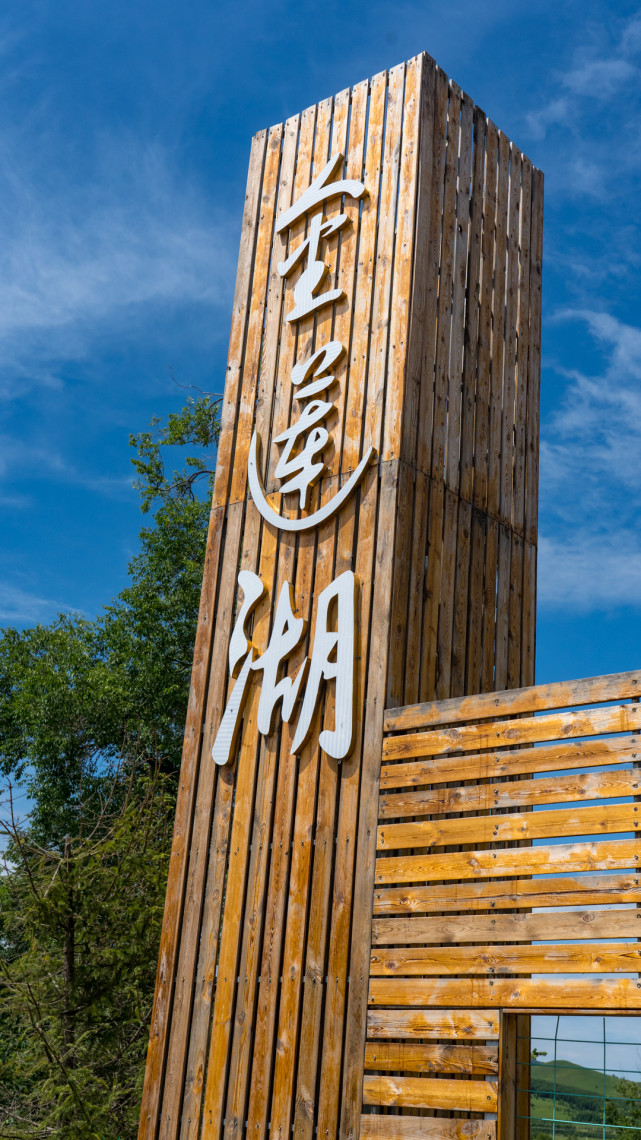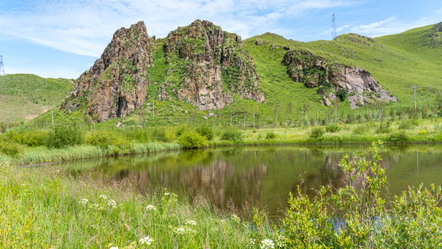 走进金莲湖,对面能看到一处裸露的山石,这在草原上不多见。山水相融,顿时让人心旷神怡。