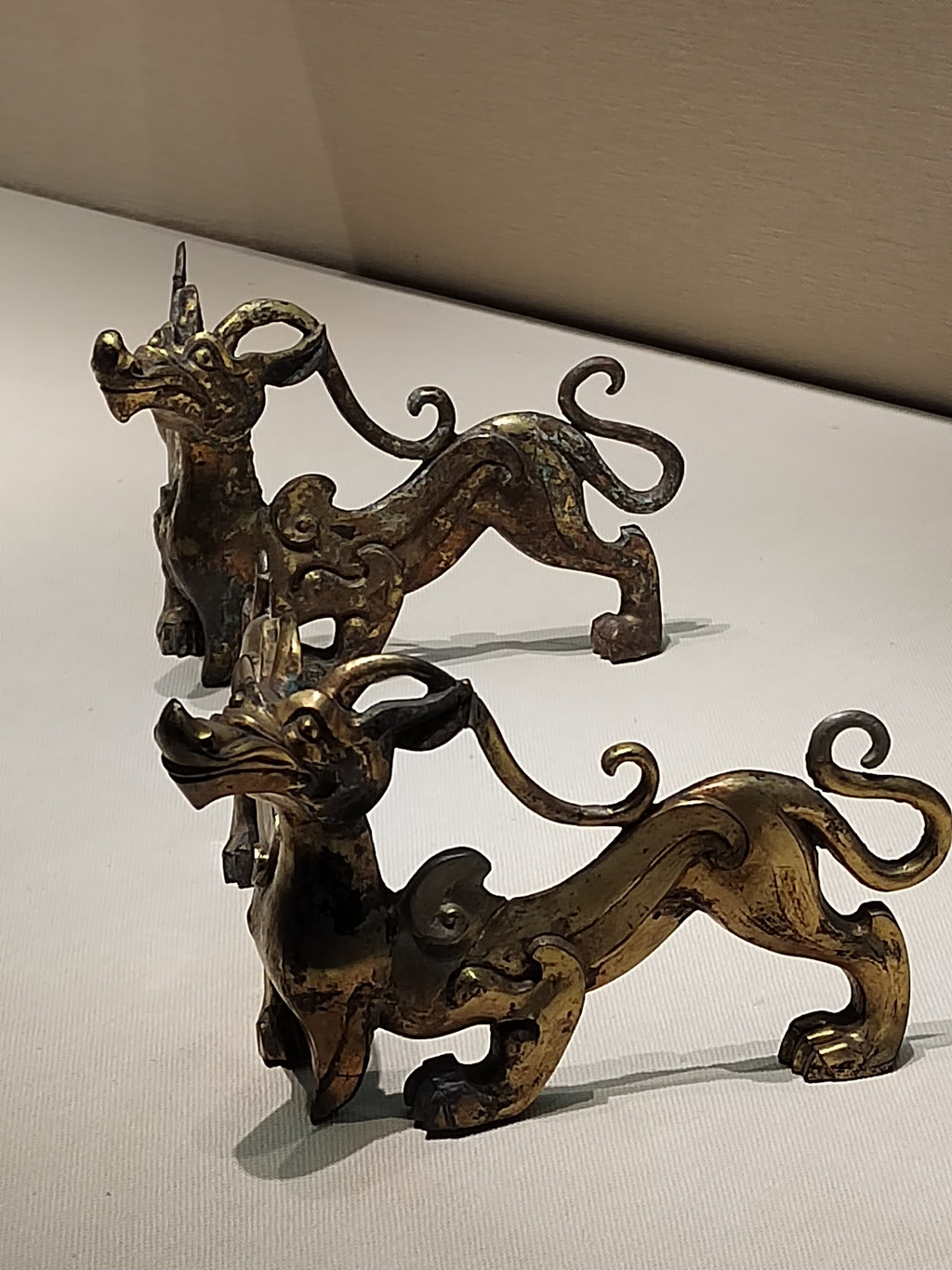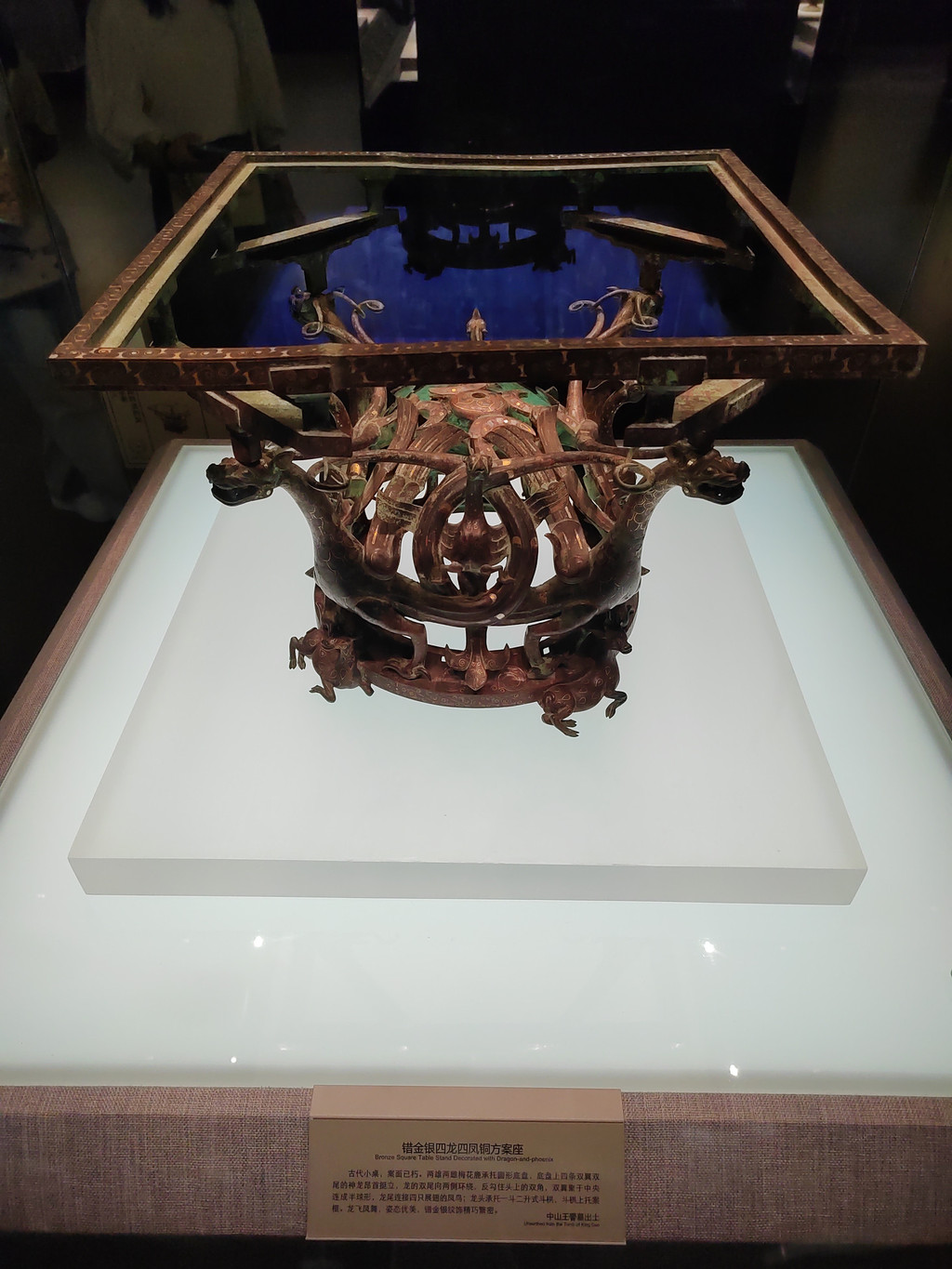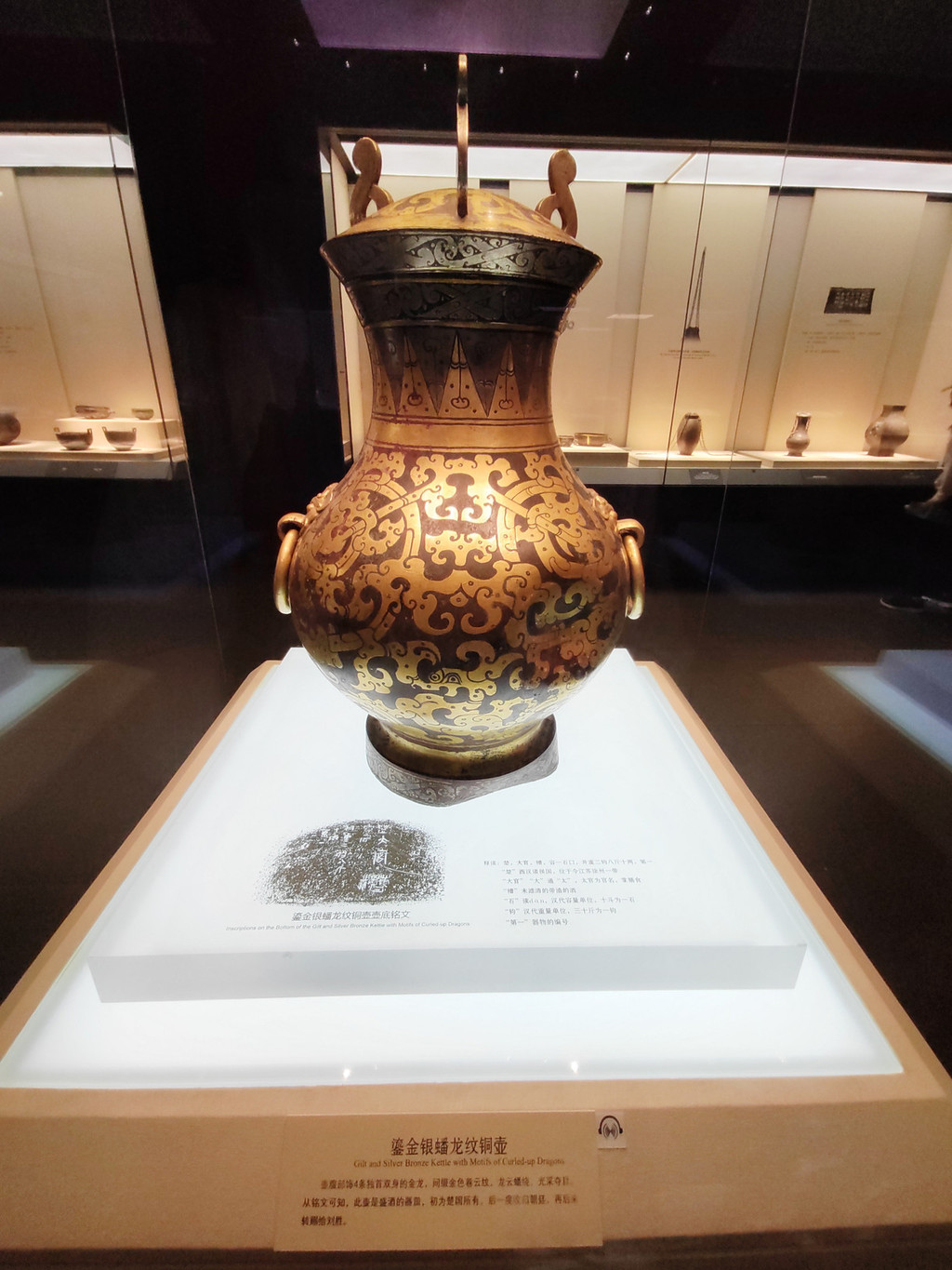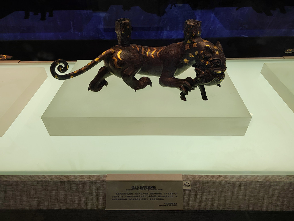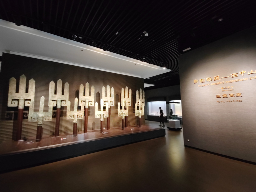 战国时期,燕赵之间其实夹着一个中山国,只不过灭国较早所以不常被提起。中山国的王室宝藏单元展示了几位中山王墓中出土的精美器物,其中中山王铁足大铜鼎有51.5厘米高,腹径65.8厘米,是其九鼎中的首鼎,外壁刻有铭文77行469字,是目前我国发现最大、铭文字数最多的铁足铜鼎。错金银四龙四凤铜方案座带有些少数民族的艺术风格,案面已无踪迹,案座结构稳定舒展,龙飞凤舞、姿态优美。还有一件错金银虎噬鹿的屏风座,形态生动,把老虎的凶猛和小鹿的柔弱表现得淋漓尽致。看了这些宝物,那消失在岁月长河里的中山国在我们心中立体了起来。