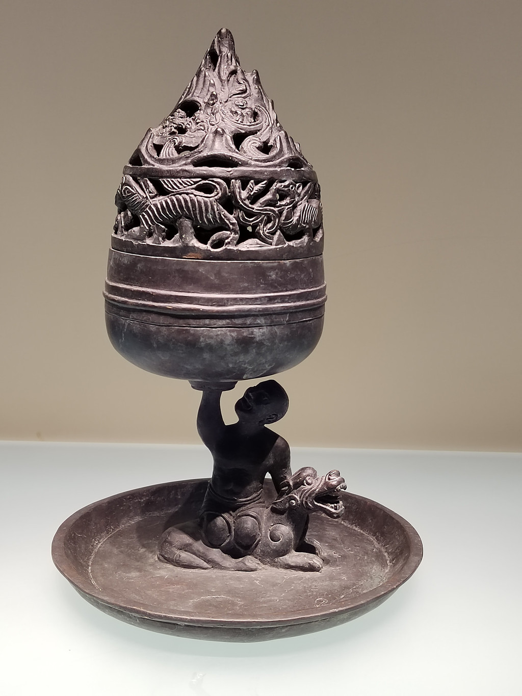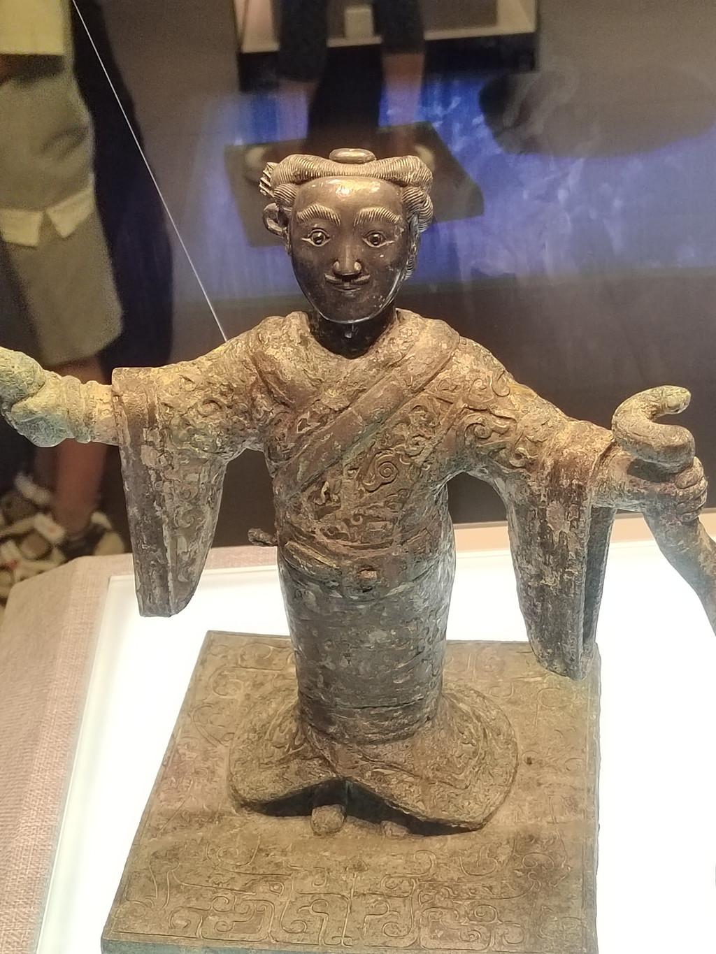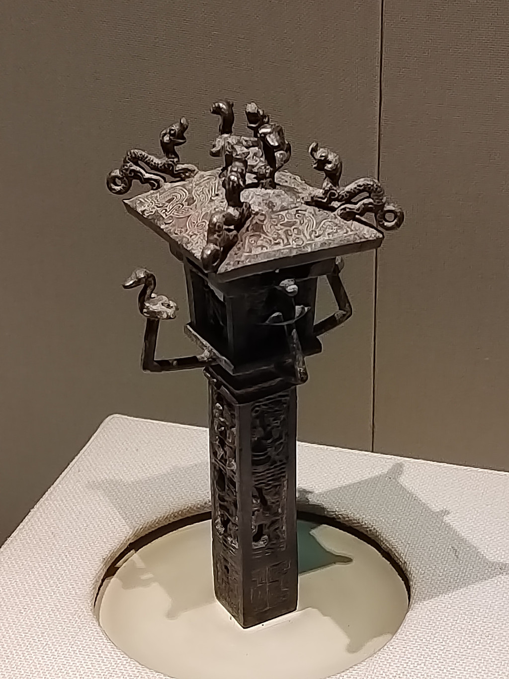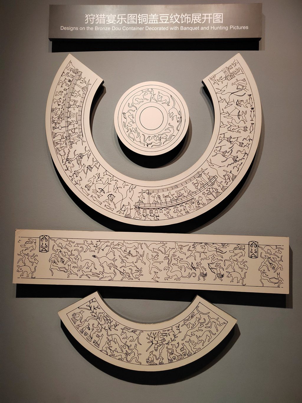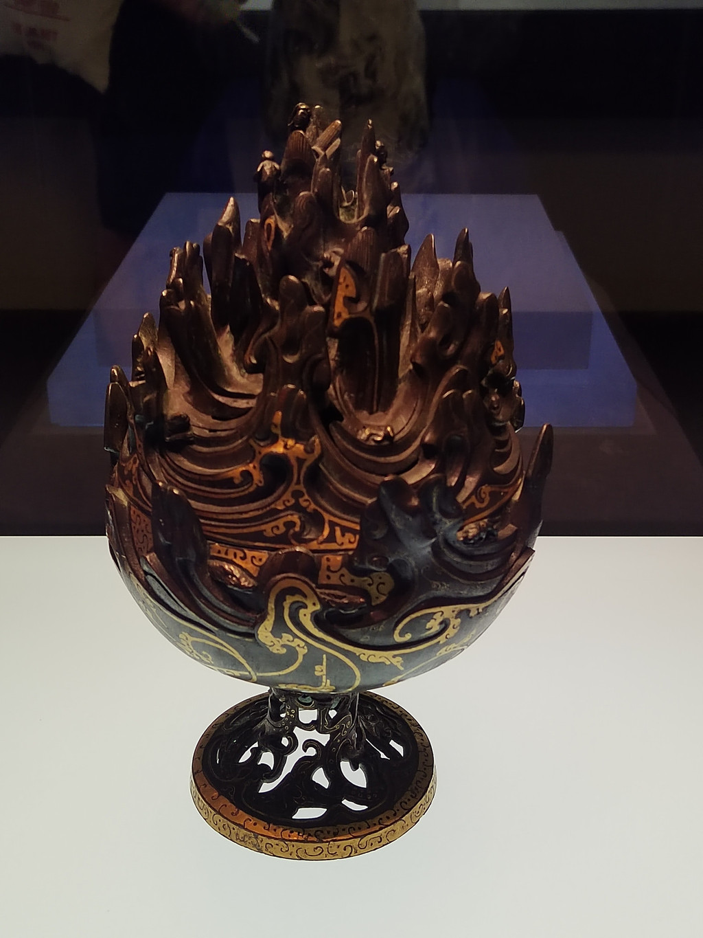 战国时期,燕赵之间其实夹着一个中山国,只不过灭国较早所以不常被提起。中山国的王室宝藏单元展示了几位中山王墓中出土的精美器物,其中中山王铁足大铜鼎有51.5厘米高,腹径65.8厘米,是其九鼎中的首鼎,外壁刻有铭文77行469字,是目前我国发现最大、铭文字数最多的铁足铜鼎。错金银四龙四凤铜方案座带有些少数民族的艺术风格,案面已无踪迹,案座结构稳定舒展,龙飞凤舞、姿态优美。还有一件错金银虎噬鹿的屏风座,形态生动,把老虎的凶猛和小鹿的柔弱表现得淋漓尽致。看了这些宝物,那消失在岁月长河里的中山国在我们心中立体了起来。