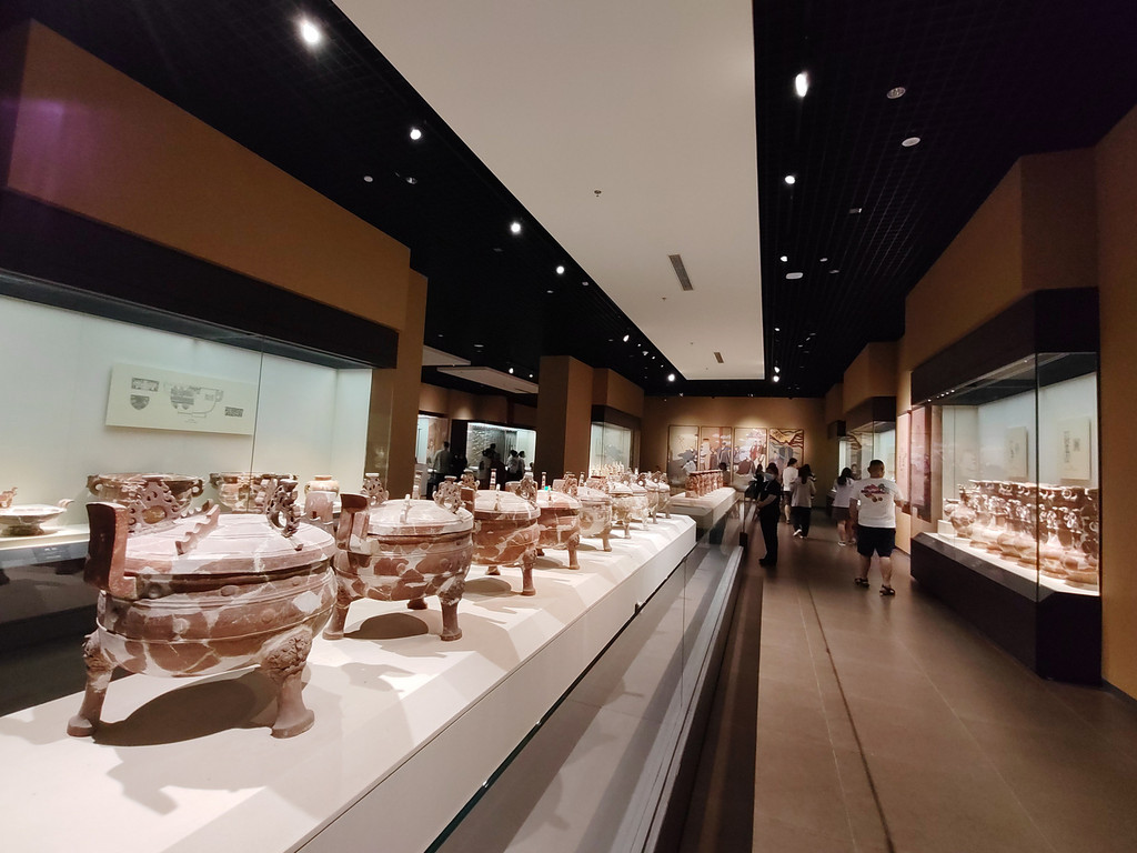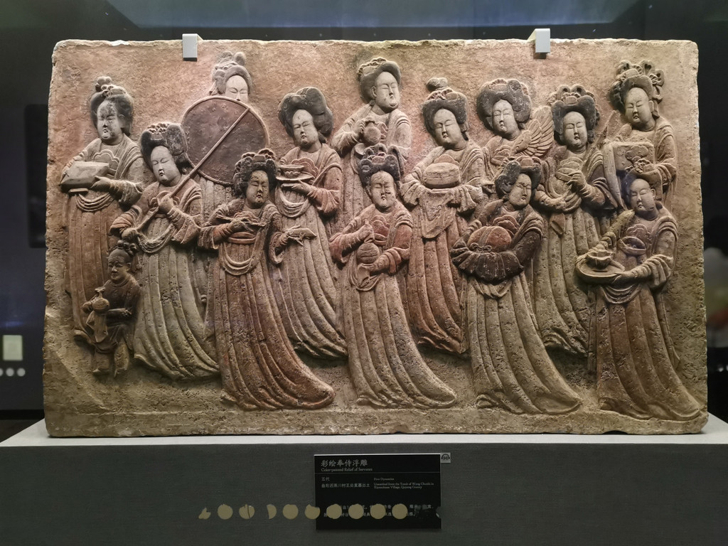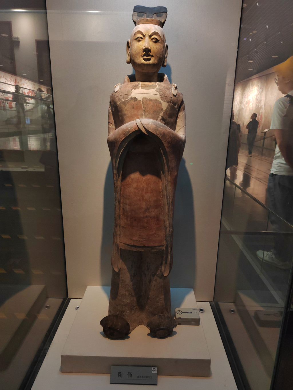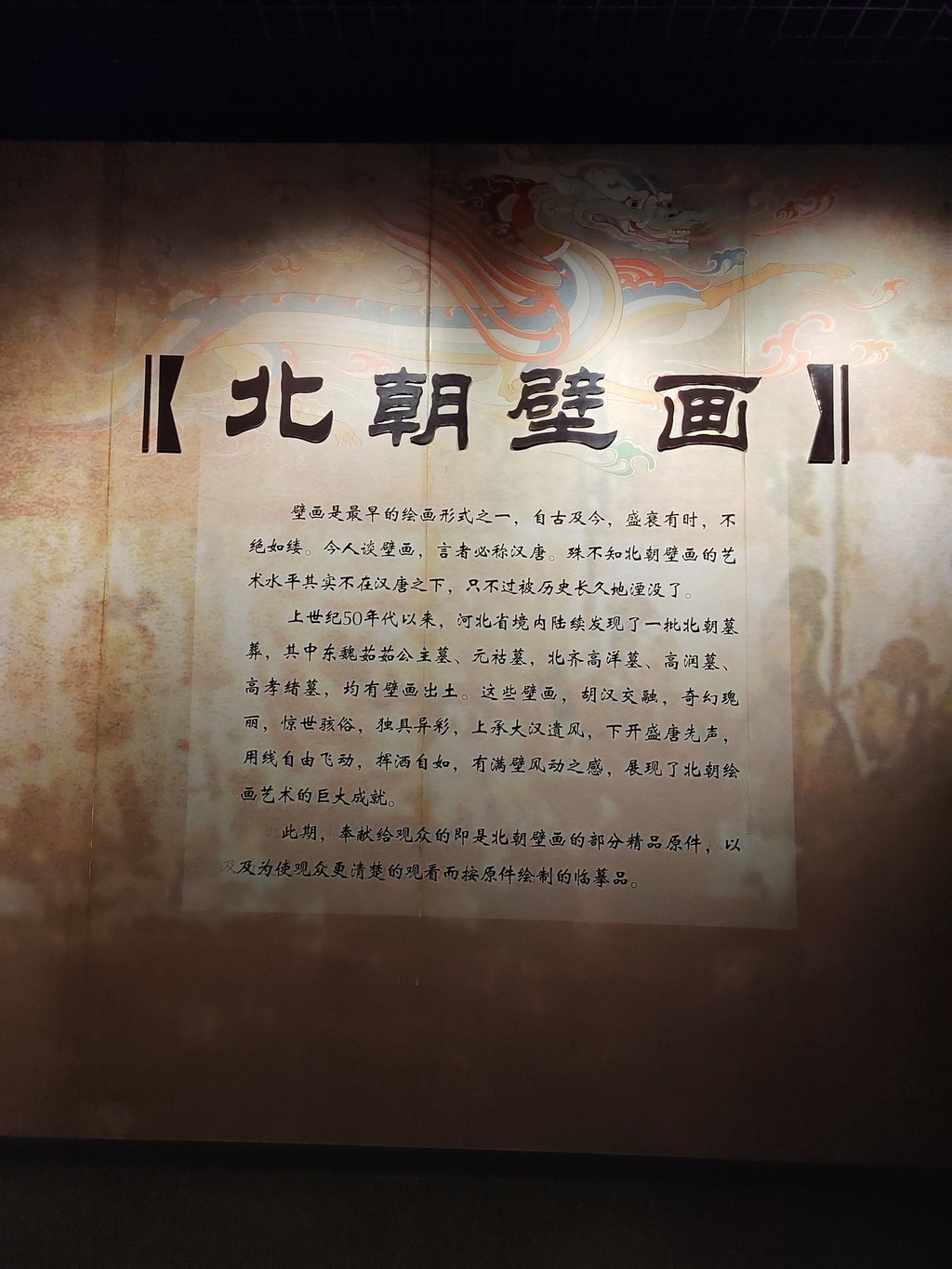 北齐壁画展厅主要展示了北朝时期几位皇帝及公主墓中出土的壁画真品以及模拟墓葬中斜坡状墓道两侧和顶部的彩绘临摹品,这些壁画异域色彩浓重,人物形制众多,胡汉交融,独具神彩。