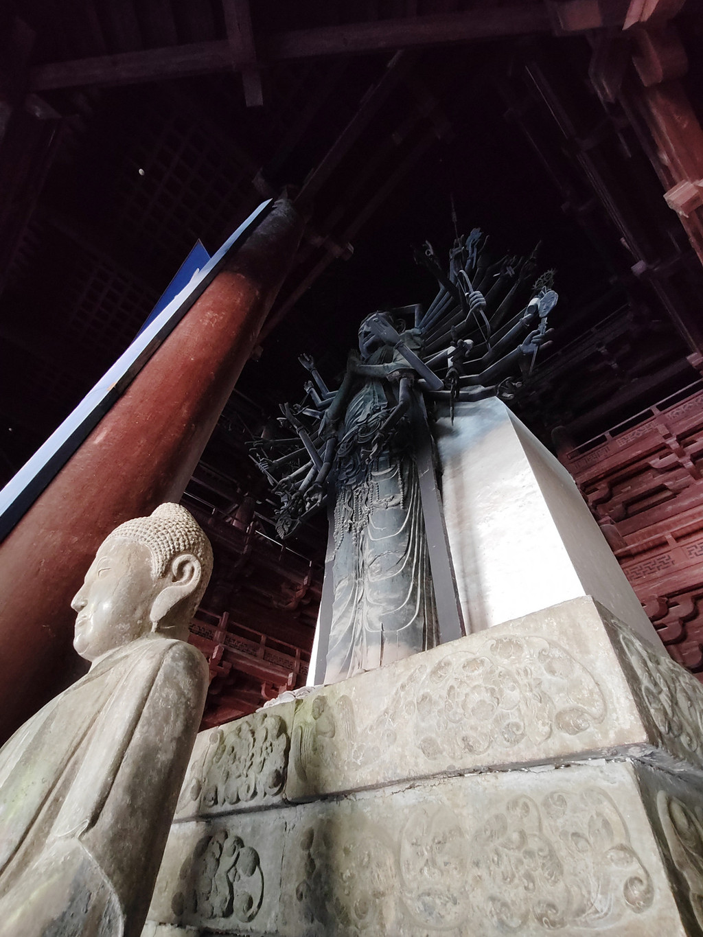 大悲阁是隆兴寺的主体建筑,始建于北宋开宝四年(971),其中供奉的是同为北宋年间铸造的铜铸千手千眼观世音菩萨立像,雕刻精美、体形巨大,是我国现存最大的古代铜铸观音。