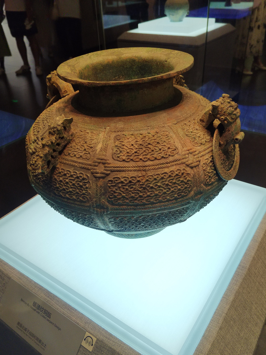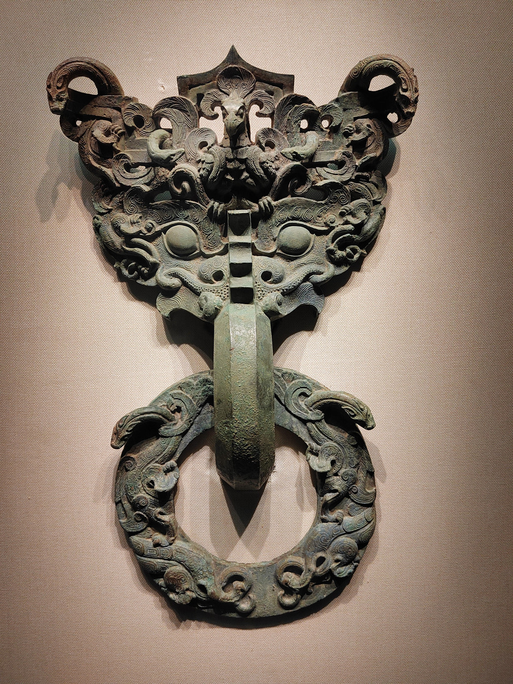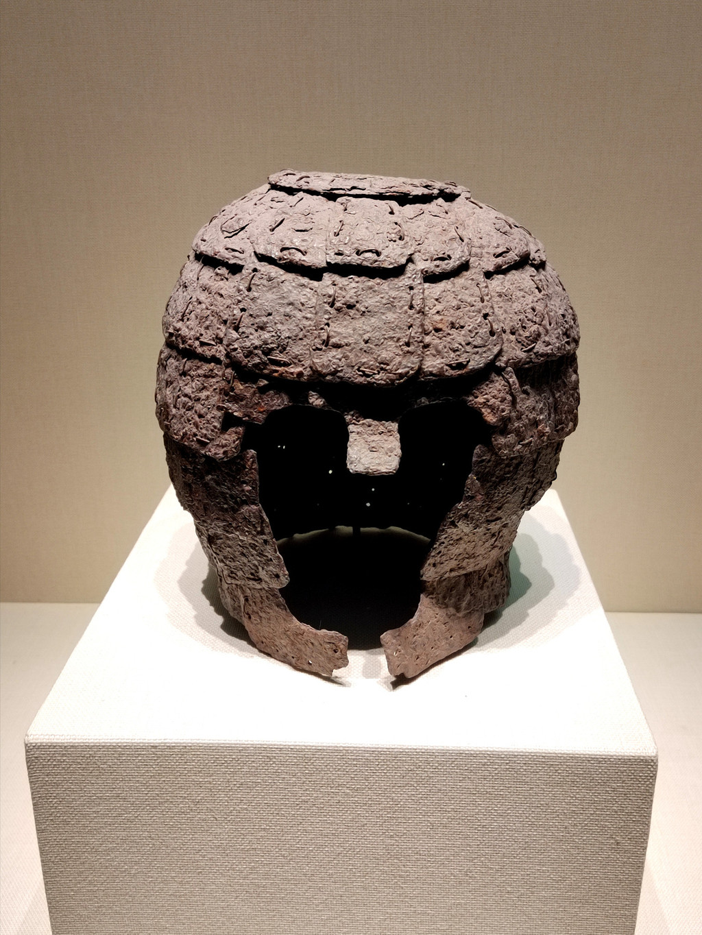 第二天9:15进入河北博物院,从旧石器时代的泥河湾—距今约200万-155万年前的马圈沟遗址发现的陶面具,到河北的商代文明里造型各异、形制精美的青铜器,都让人对远古时代发生在河北大地的事物产生浓厚的兴趣。而在慷慨悲歌——燕赵故事中,第一件透雕龙凤纹铜铺首就让人震撼:长4.5厘米,宽36.8厘米,重21.5公斤,它是燕国宫殿大门上的门环,由此可推断出当时燕下都宫殿是何等高大宏伟。还有目前仅见的先秦铁胄,由89块铁皮编缀而成,边上一位男士对他孩子说:嘿你看是不是很像万磁王的头盔?这……可够穿越的。
