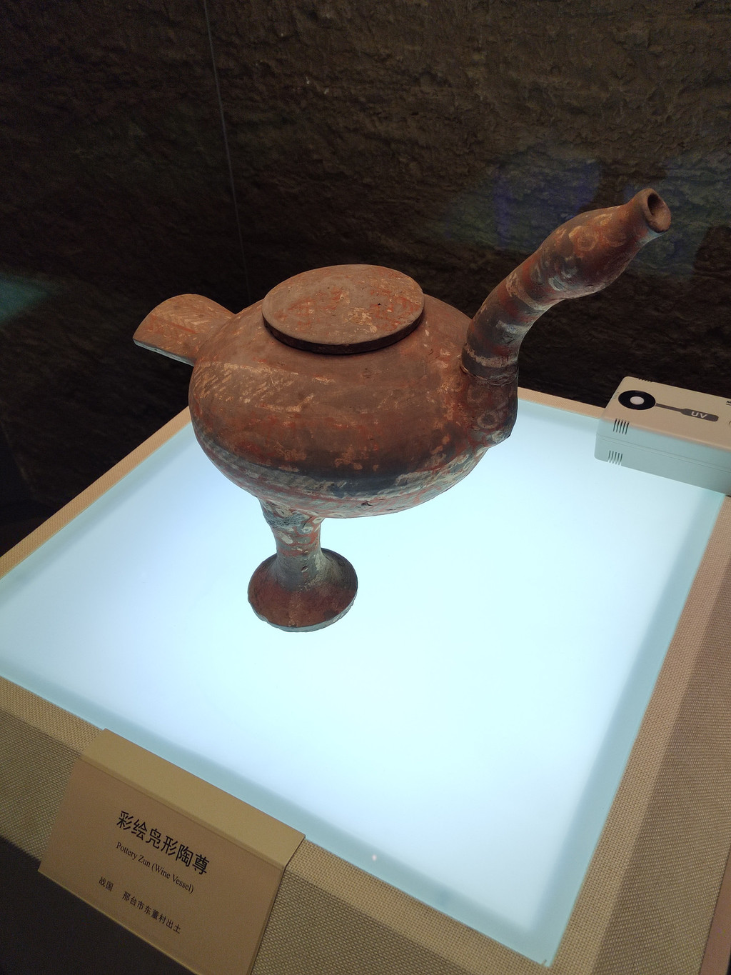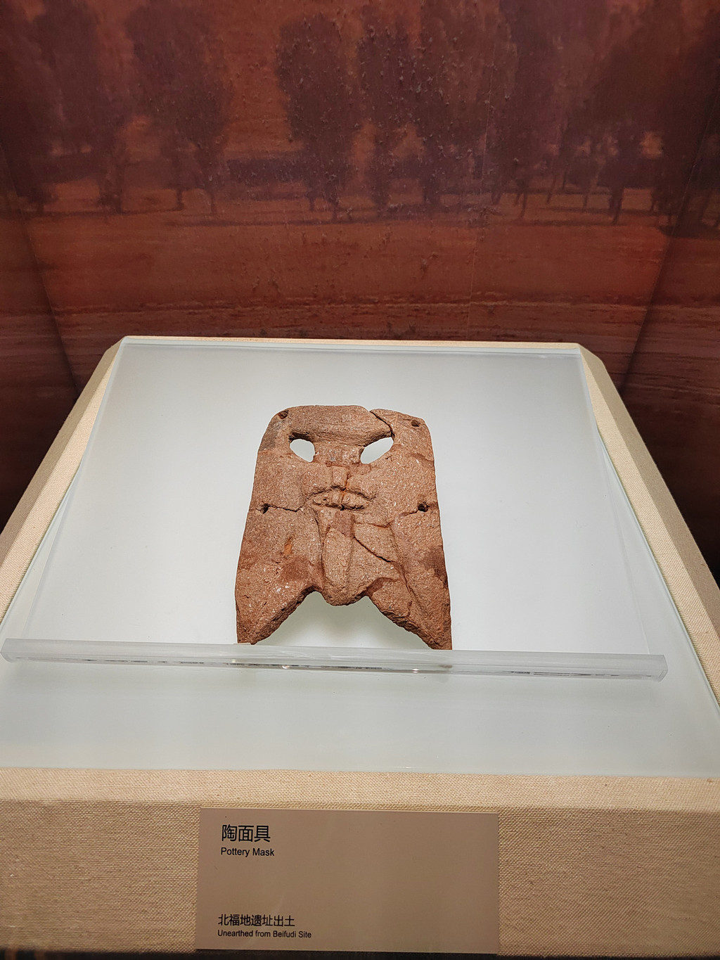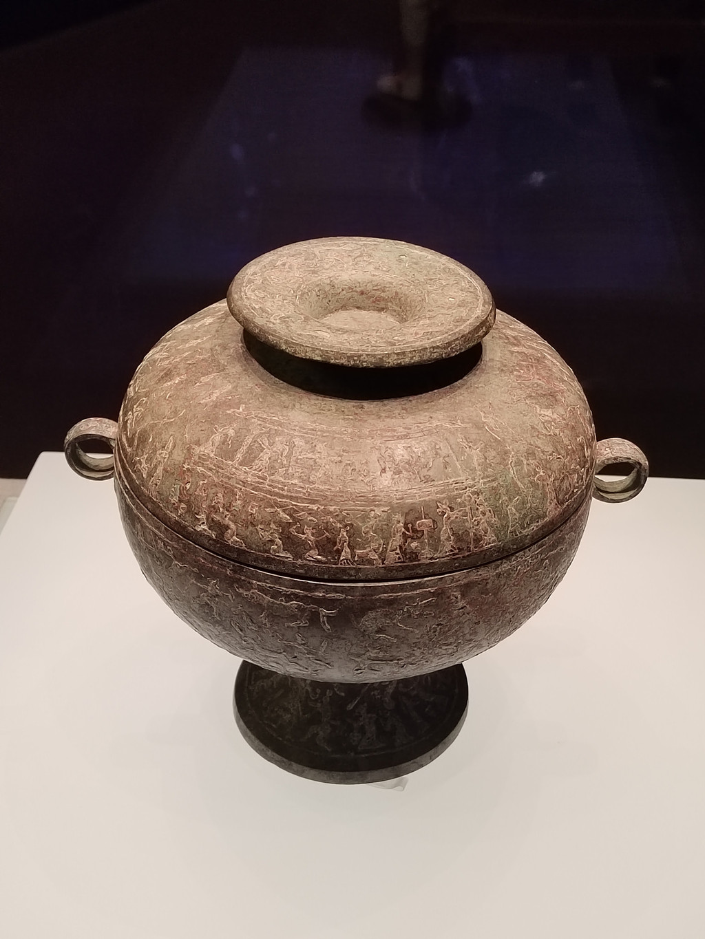 第二天9:15进入河北博物院,从旧石器时代的泥河湾—距今约200万-155万年前的马圈沟遗址发现的陶面具,到河北的商代文明里造型各异、形制精美的青铜器,都让人对远古时代发生在河北大地的事物产生浓厚的兴趣。而在慷慨悲歌——燕赵故事中,第一件透雕龙凤纹铜铺首就让人震撼:长4.5厘米,宽36.8厘米,重21.5公斤,它是燕国宫殿大门上的门环,由此可推断出当时燕下都宫殿是何等高大宏伟。还有目前仅见的先秦铁胄,由89块铁皮编缀而成,边上一位男士对他孩子说:嘿你看是不是很像万磁王的头盔?这……可够穿越的。