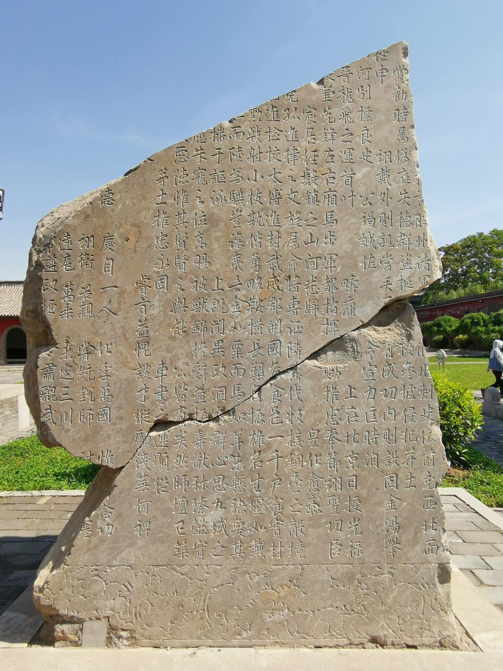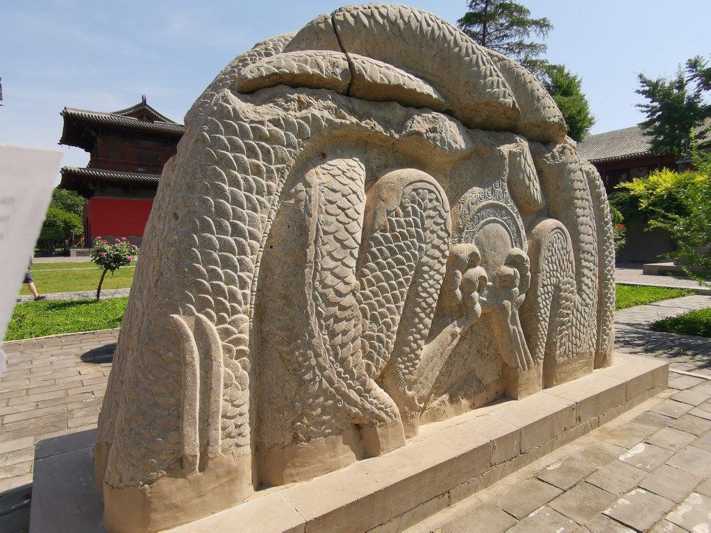 在大悲阁前面右侧空地上有我国现存最早的楷书隋碑第一之称的龙藏寺碑,立于隋开皇六年(586),上承南北朝之遗韵,下开初唐诸家之先河,在书法发展史上处于承前启后的地位,可惜年代久远,许多字迹已经不清了,但年代还是很清晰的(石碑只做了砖挡,没用玻璃罩罩起来,有点意外)。