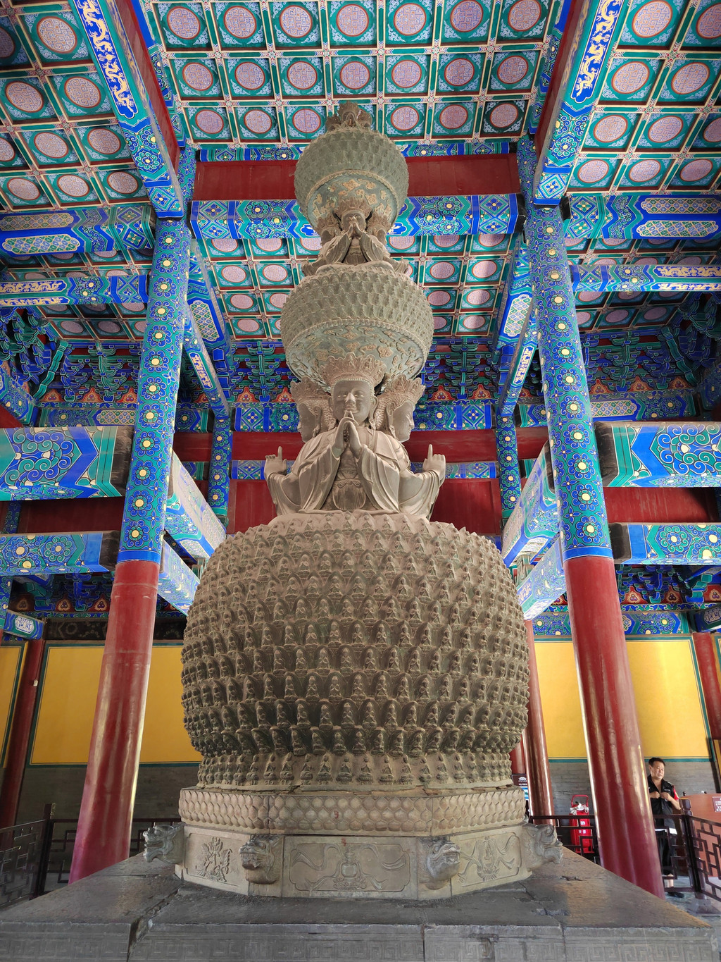 中轴线最后的毗卢殿里供奉的是明万历皇帝为其生母祝寿所制的铜铸毗卢佛,由三层莲座和三层共计1072尊大小佛像组成,构思巧妙、造型独特,堪称绝品。