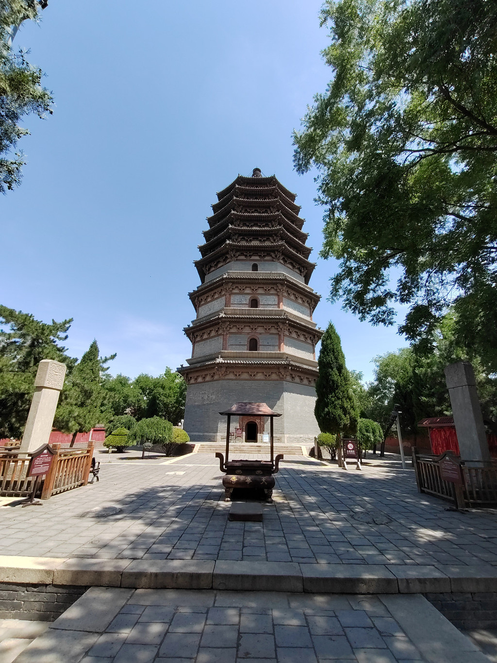 之后到阳和楼边上的临济寺看澄灵塔,临济寺整个寺院建制保存比较完整,有几进院子,现在还可以拜佛烧香。寺院初创于东魏(540),而澄灵塔则为唐咸同八年(867)修建,为八角九层密格式实心砖塔。
