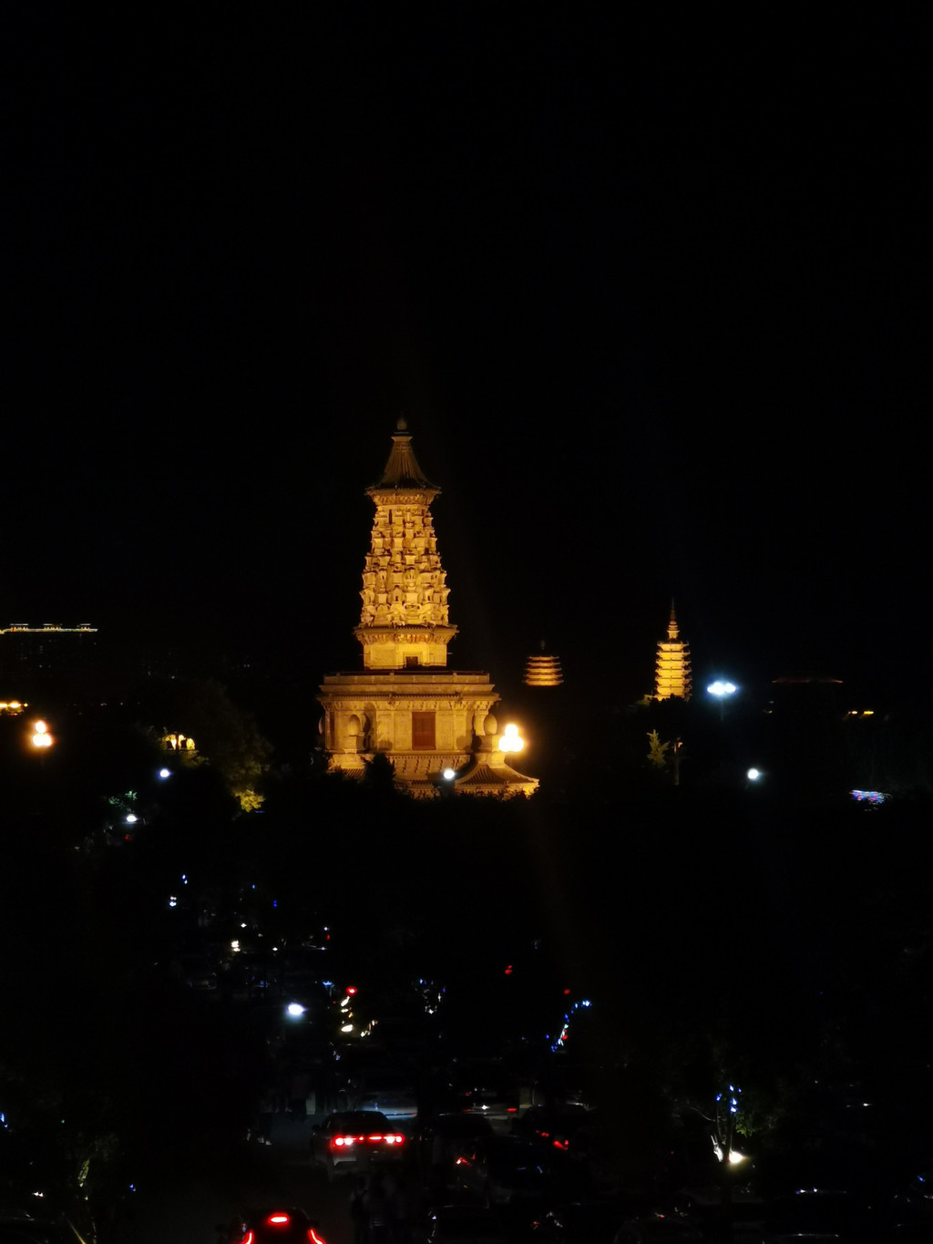 走走停停一晃儿就下午四点了,肚瘪腿软实在不行了,出门直奔高建民酒楼的驴肉火烧而去。因为昨天在正定古城只逛了隆兴寺,而它又足够让人惊艳,于是决定改变行程再回古城住一晚(就住在南大门和阳和楼之间的主路上),明天继续古城寻宝。晚上顺便看看夜景,图片中是从南城墙拍的华塔和远处的澄灵塔。