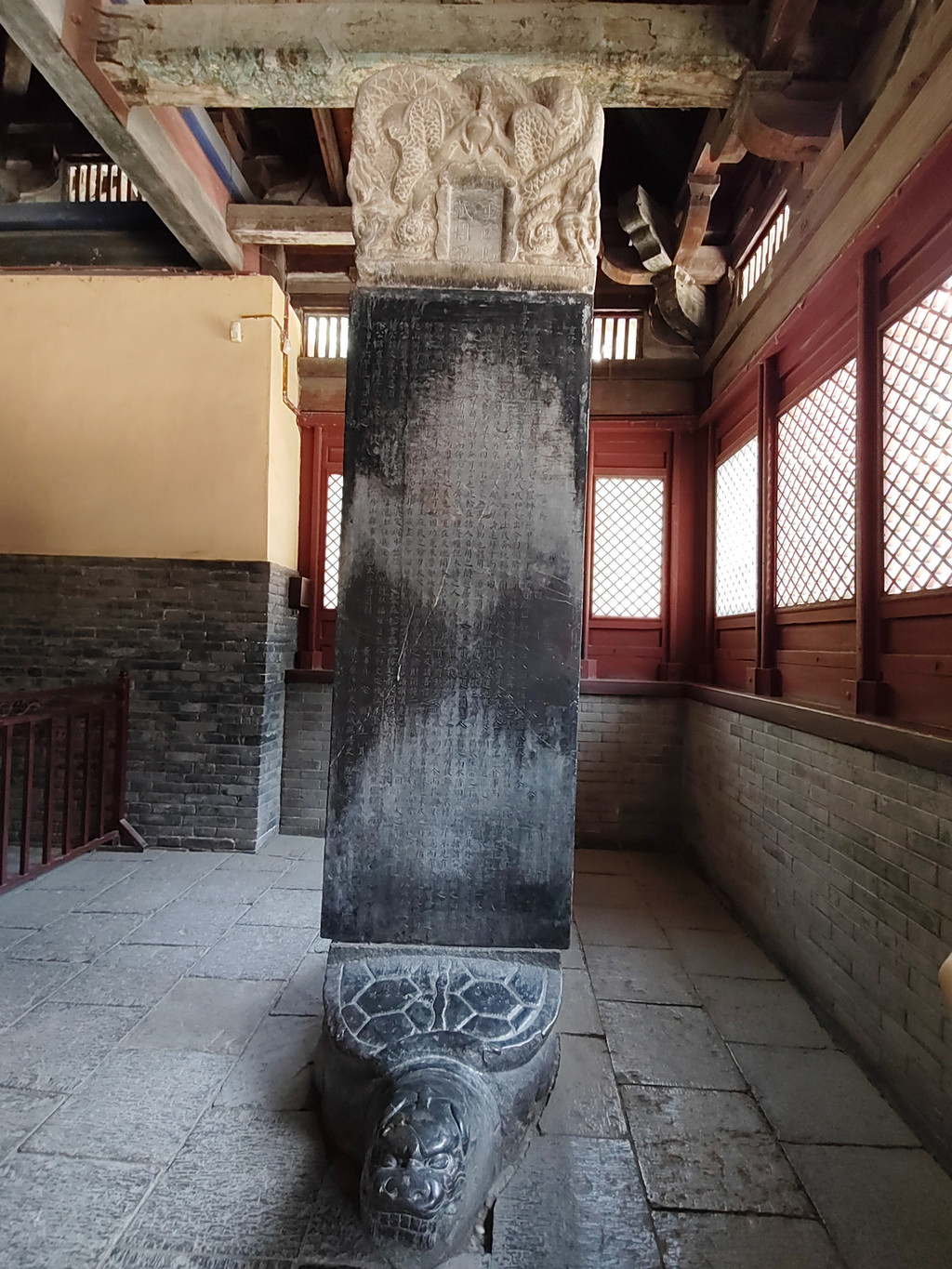 过了摩尼殿往里走,左侧的转轮藏阁里是国内现存最大、年代最早(宋)的转轮藏,直径七米,是一座能收藏经文、时至今日仍能转动的旋转大书架;在它的边上有一座不起眼的石碑,细看之下发现落款里赫然有明末清初“一门三进士”、同列“九卿”的梁氏三兄弟,均乃明朝政治家梁梦龙的曾孙,妥妥的学霸之家啊,也许这就是看碑文的乐趣吧。出来在商品部附近还是个不起眼的地方有个大玻璃罩,里面矗立着元朝著名书法家赵孟頫晚年书丹并篆刻的“圣主本命长生祝延碑”碑文字体端雅慎密、酣畅温润。