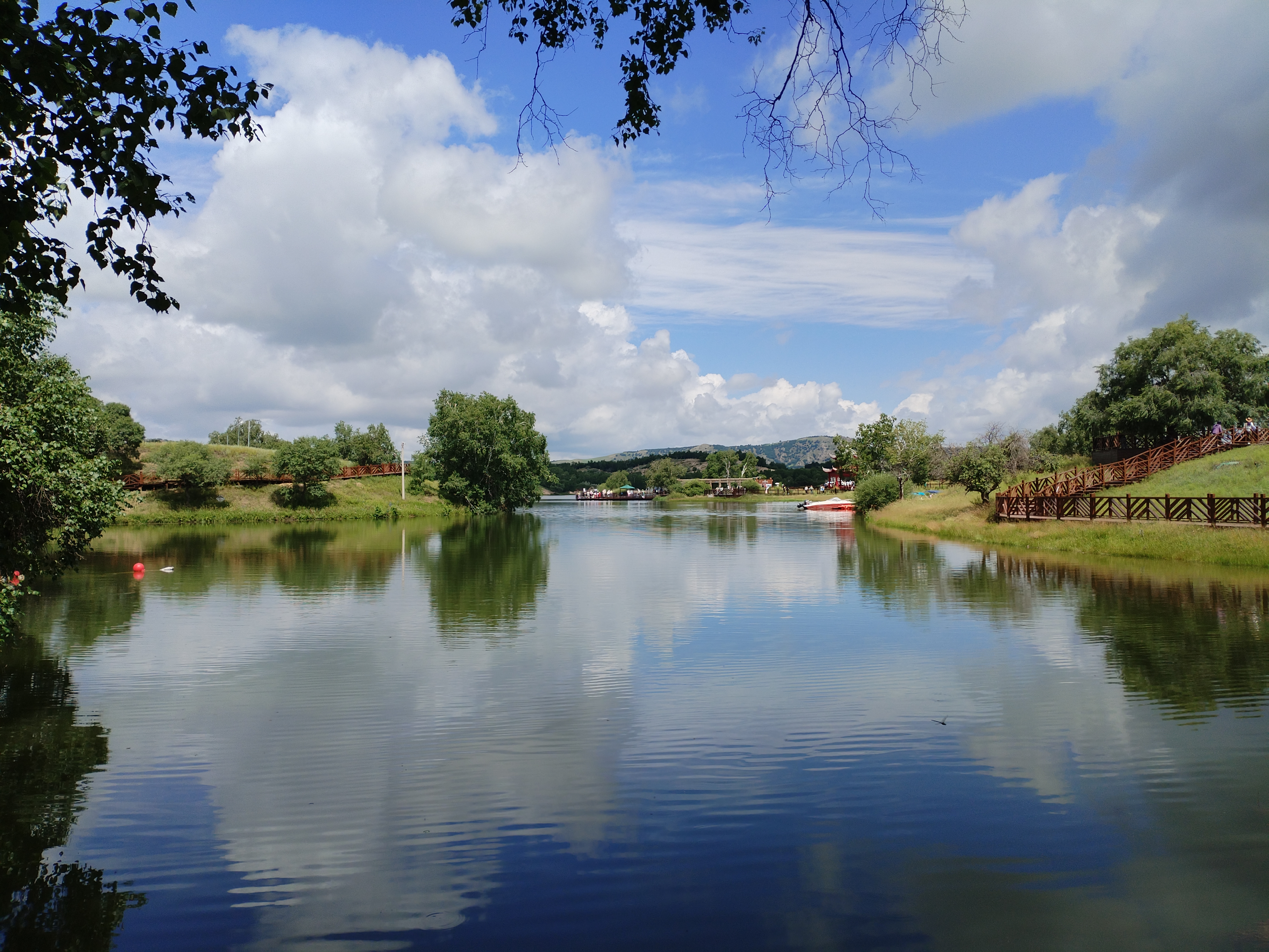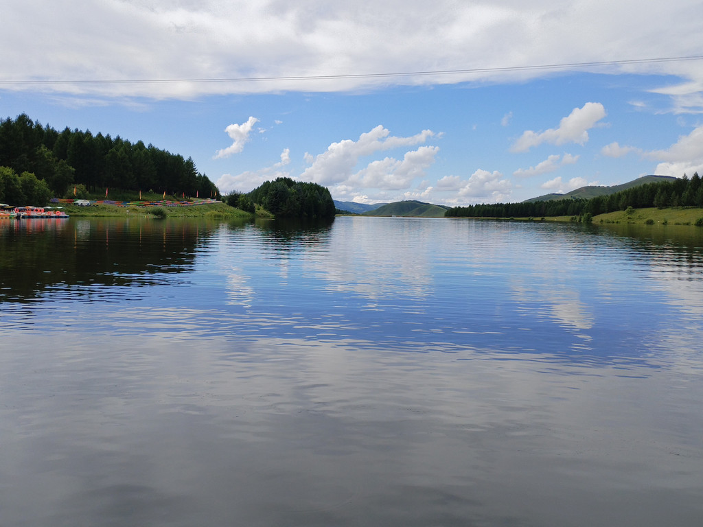 公主湖是乌兰布统草原的一颗璀璨明珠,周围不仅有波澜起伏、鲜花竞放的草原,还有茂密苍翠的桦树松树等树木。蓝天白云倒映在公主湖中,水天相接,美不可言。