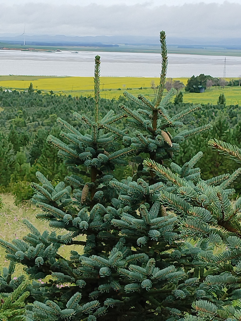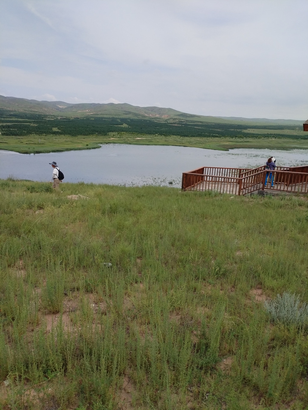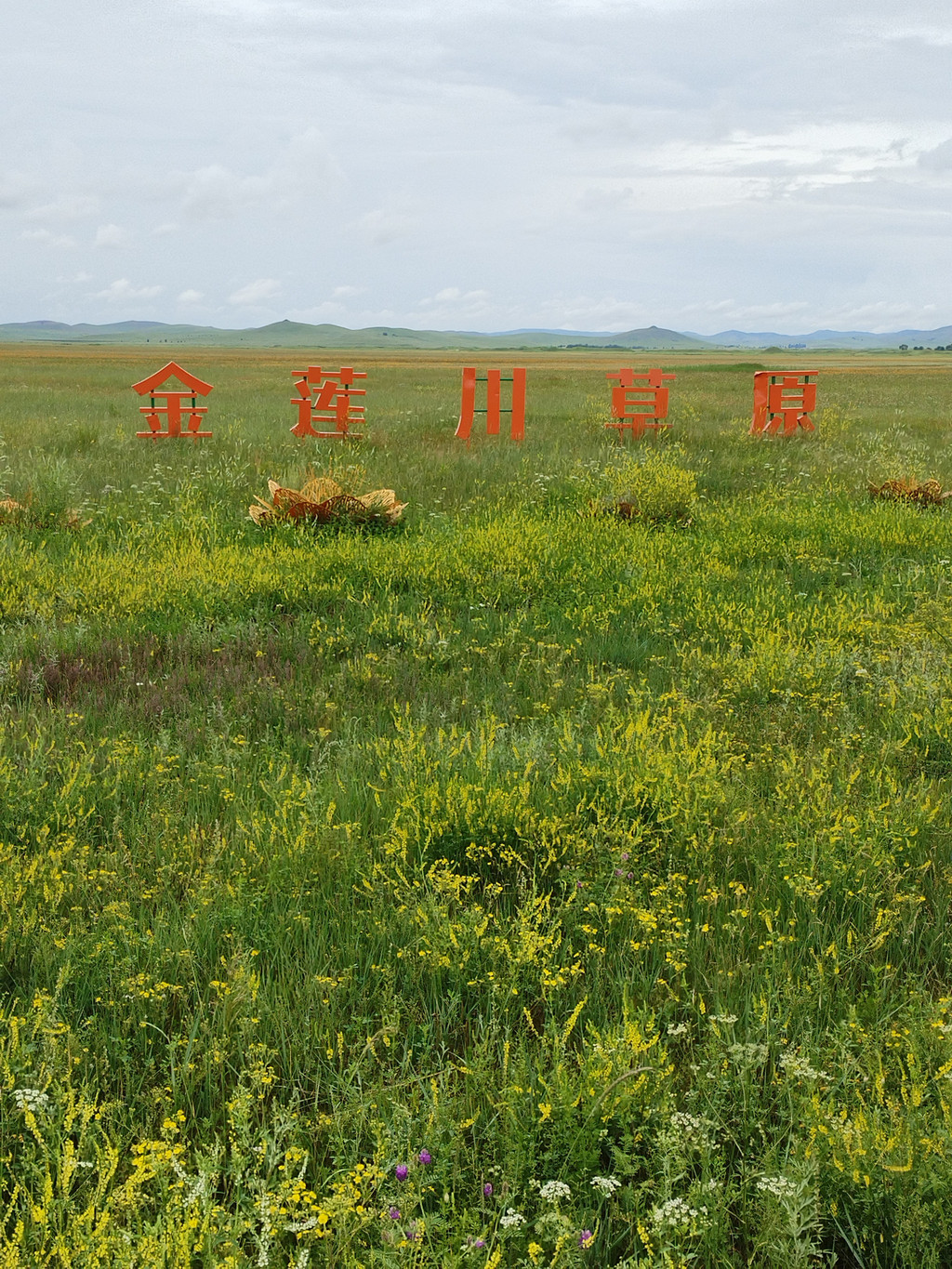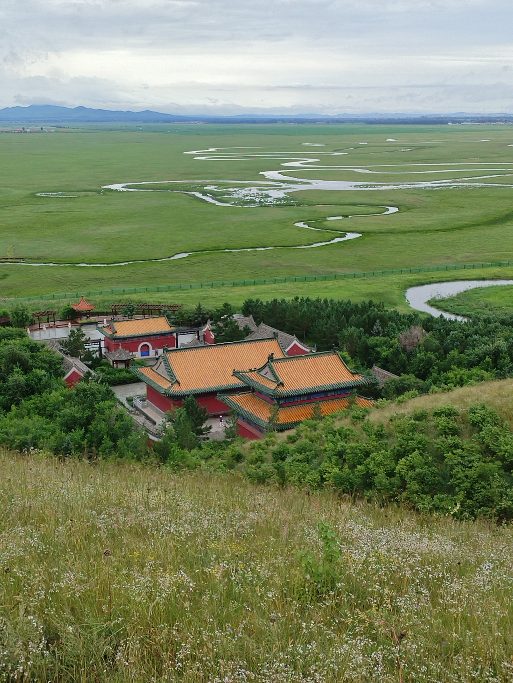 湖叫草原湖,在转佛山的西面。这个湖名也是名副其实,因为它的四面都是风吹草低见牛羊的草原。转佛山下西面的草原上,正盛开着一大片黄色的野花,和草原湖相映成趣。
