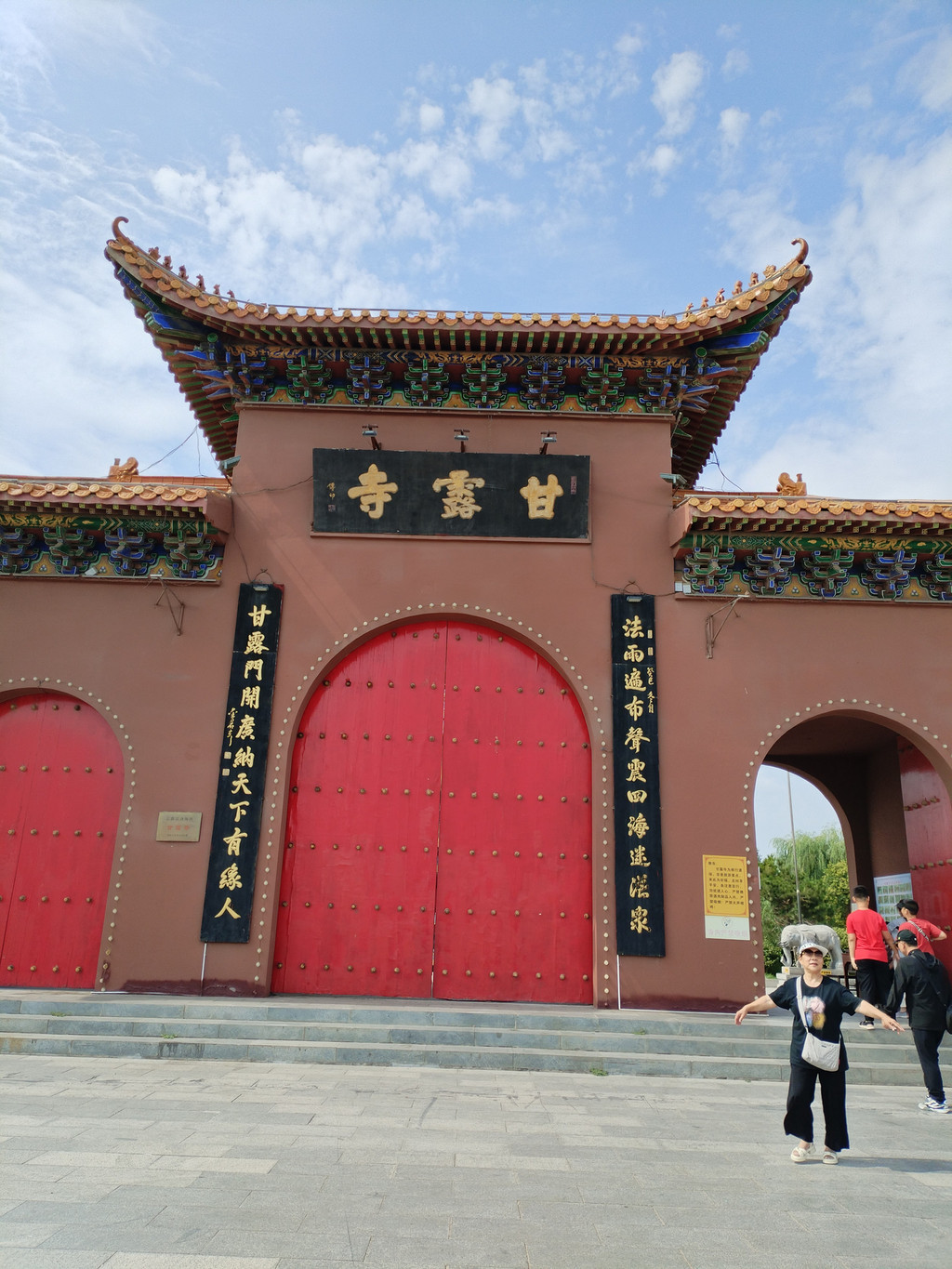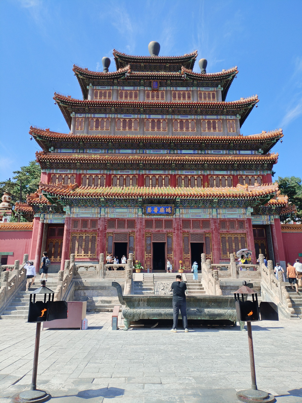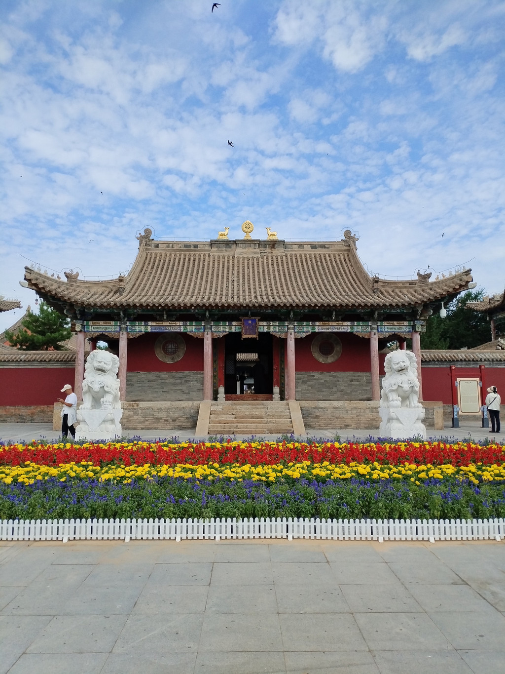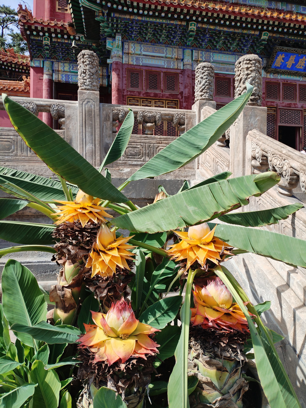 普宁寺也是一座汉藏结合寺庙:寺庙前半部为汉式,具有汉族传统佛教寺庙的特征;后半部为藏式,仿西藏桑鸢寺而建。普宁寺主殿大乘之阁里,供奉有世界上最大的金漆木雕佛像——千手千眼观世音菩萨,佛像身高23.51米,差不多有六层楼那么高。阿李认为,普宁寺独特之处,除了有世界上最大的木雕千手千眼观世音菩萨像,还有它大殿前那两大盆盛开的地涌金莲花——阿李第一次看到这种花朵如此巨大、花瓣如此多层、花色如此绚烂的大花,忍不住欣赏了很久。