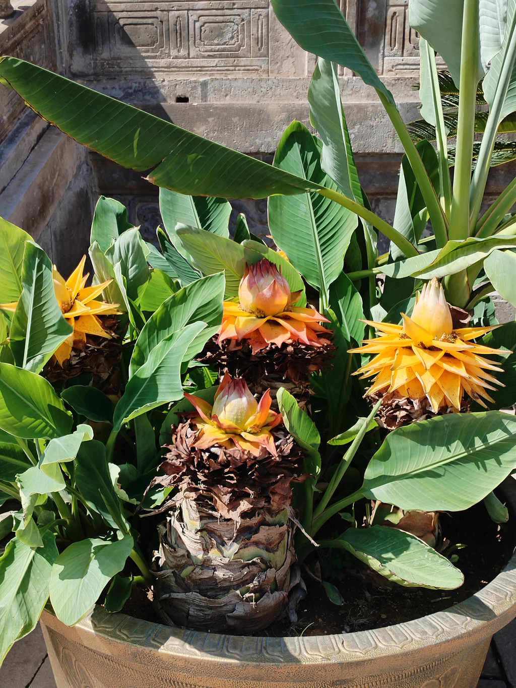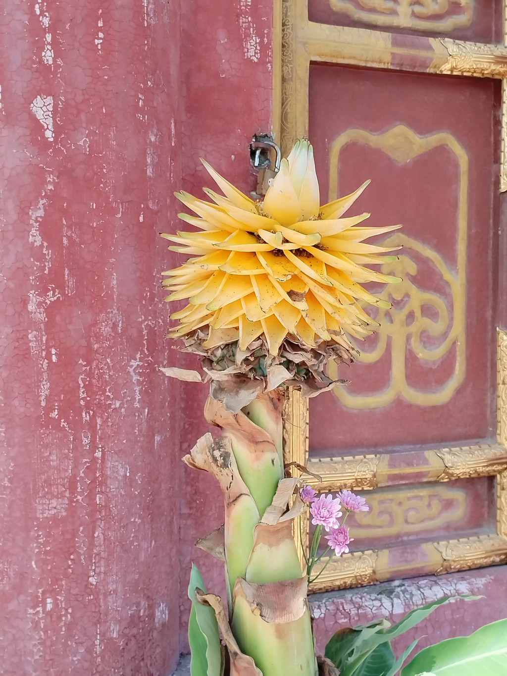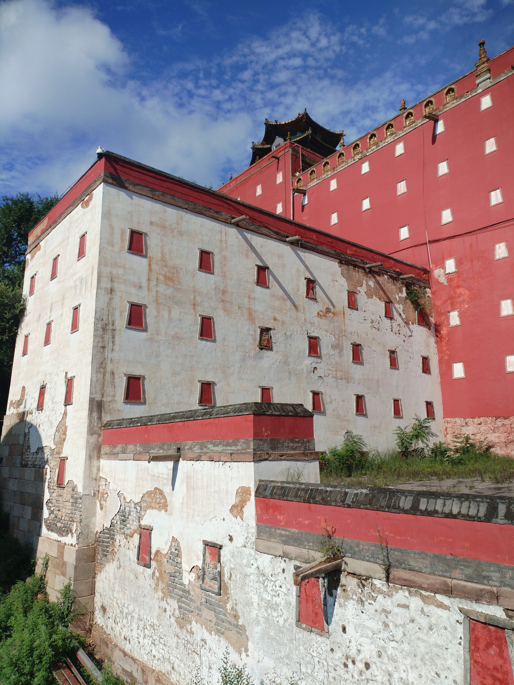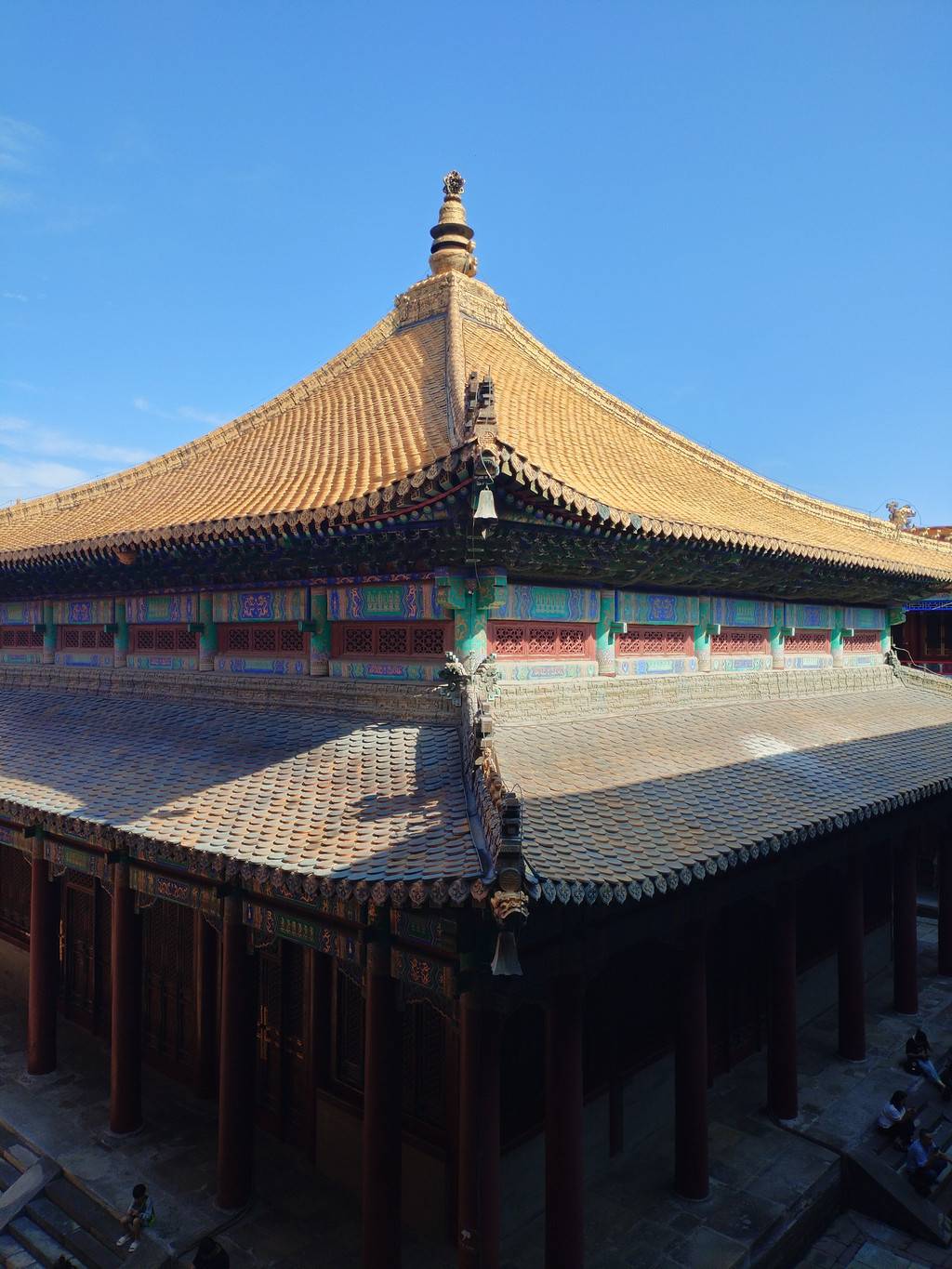 普宁寺也是一座汉藏结合寺庙:寺庙前半部为汉式,具有汉族传统佛教寺庙的特征;后半部为藏式,仿西藏桑鸢寺而建。普宁寺主殿大乘之阁里,供奉有世界上最大的金漆木雕佛像——千手千眼观世音菩萨,佛像身高23.51米,差不多有六层楼那么高。阿李认为,普宁寺独特之处,除了有世界上最大的木雕千手千眼观世音菩萨像,还有它大殿前那两大盆盛开的地涌金莲花——阿李第一次看到这种花朵如此巨大、花瓣如此多层、花色如此绚烂的大花,忍不住欣赏了很久。