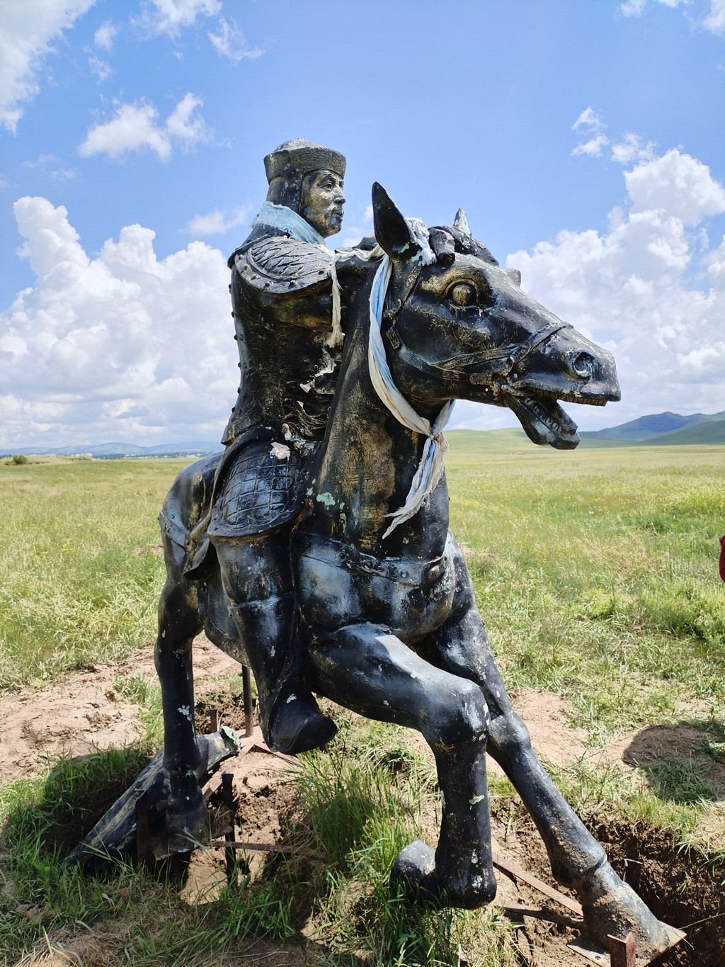 我们参观的将军泡子,就是当年清军和噶尔丹叛军激战的地方。康熙的舅父佟国纲将军当年就是战死在这里。佟国纲将军的遗体虽被运回北京安葬,但他的战袍却埋在这里,成为将军墓。这个地方也因此得名“将军泡子”——“泡子”是北方方言,湖泊的意思。现在,在将军墓旁,立有一戎装将军跨马雕像。