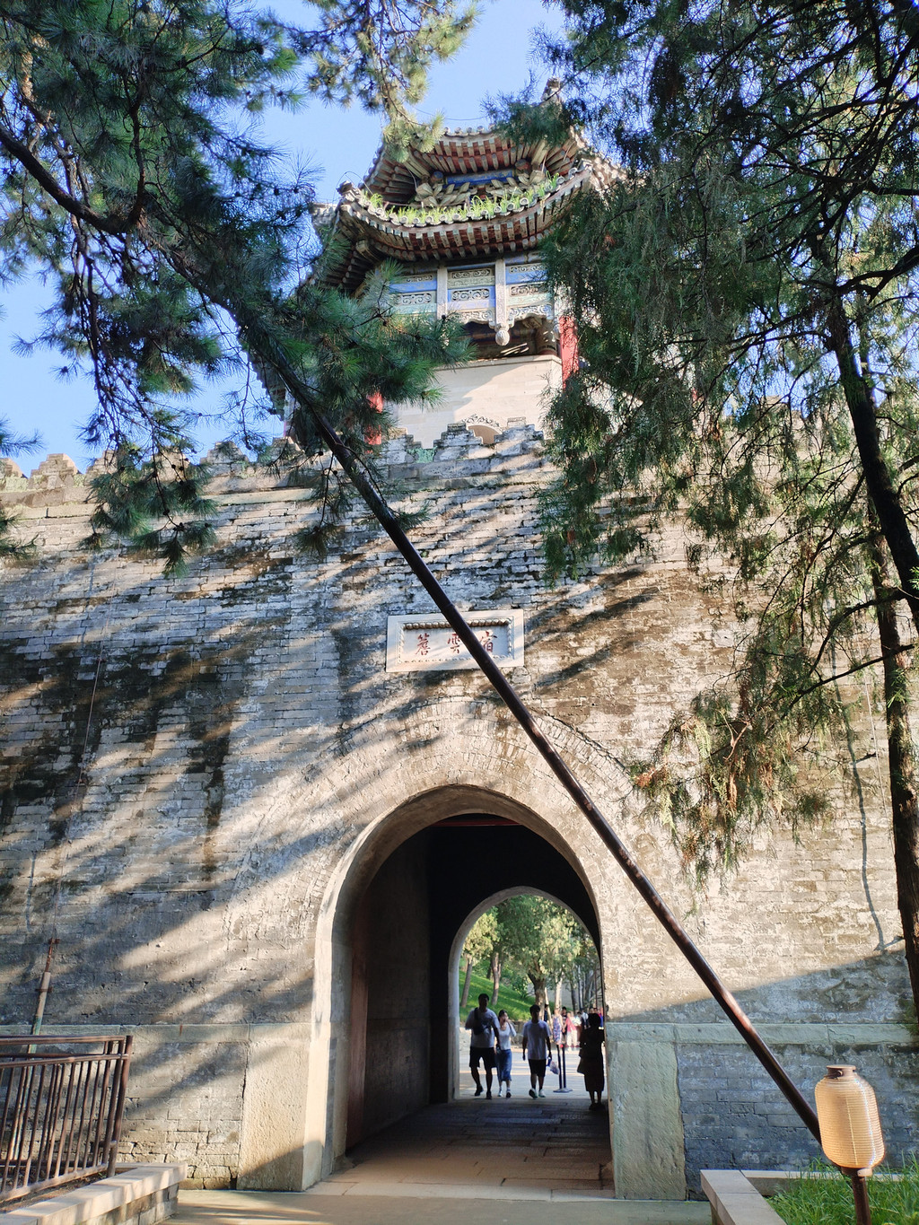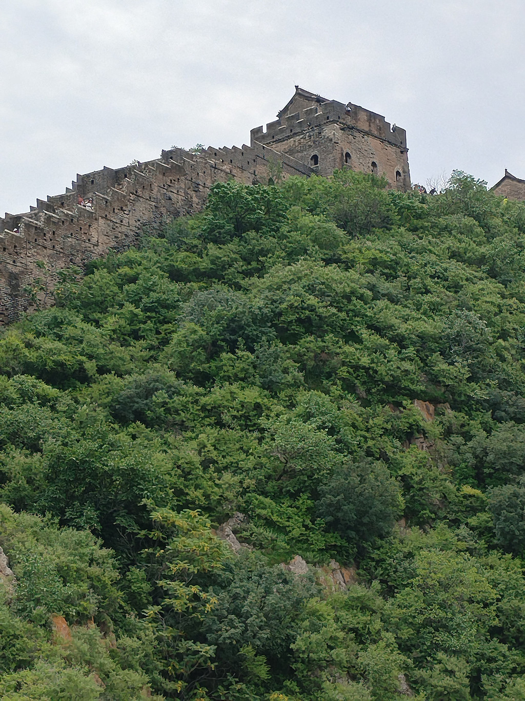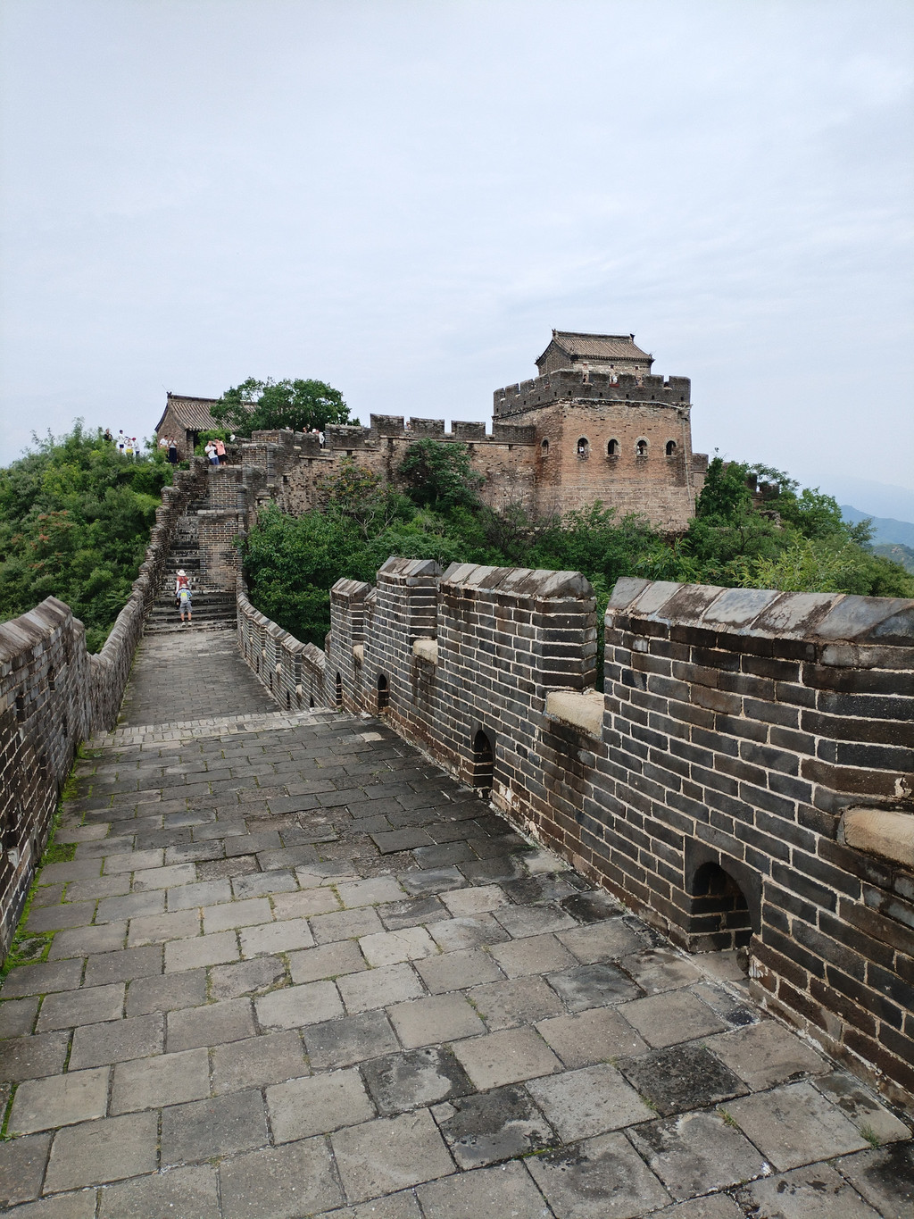 我们登上门楣上写着“大好河山”四个大字的的城楼时,正下着小雨,气温较低。没过一会儿,雨竟然停了。我们脱下雨衣,在宽阔的大境门城楼上漫步,边走边欣赏美景:城楼建在两山之间,东太平山上,树木葱茏,山顶云雾缭绕;西太平山上,长城依随着山势逶迤而行。这座关隘,真的是一夫当关万夫莫开!阿李随后爬了西太平山上的一段长城,到达山顶,看了烽火台,之后欣然下山。