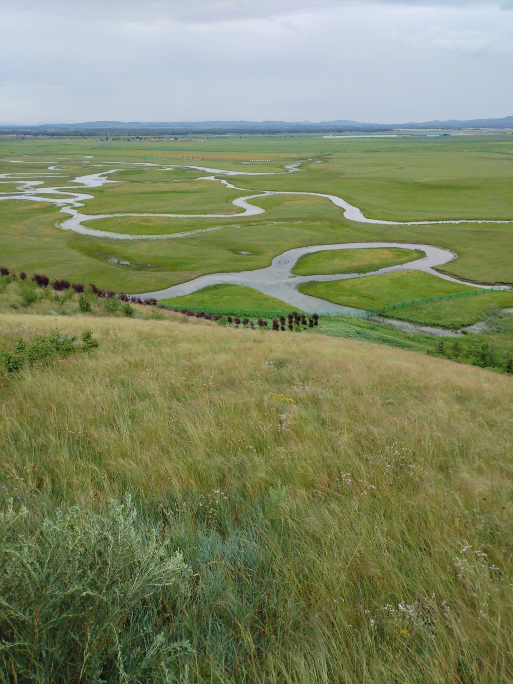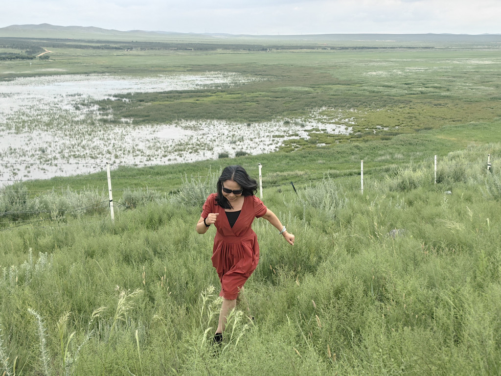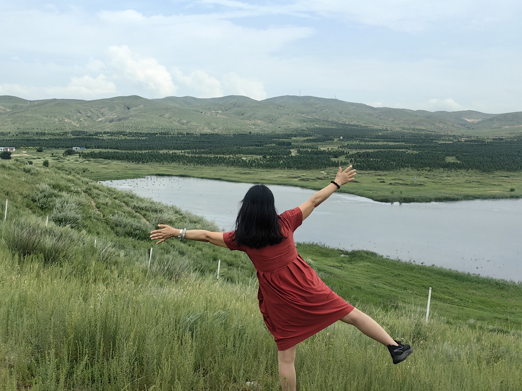锡林九曲和平顶山火山地质公园都是锡林郭勒草原的一部分,两个景区相距十五公里。锡林九曲是锡林河河道形成的典型河曲景观——河道呈现“九曲十八弯”形态。我们游玩那里时,只有部分河道里有水,一曲都看不出,更别说九曲十八弯了。锡林河两岸是辽阔的牧场,牧草十分茂盛。我们虽然没看到锡林河九曲十八弯,但游兴并没有受到任何影响——阿李和两位旅游搭子,在草原上各种摆拍,拍了无数张搔首弄姿的照片。