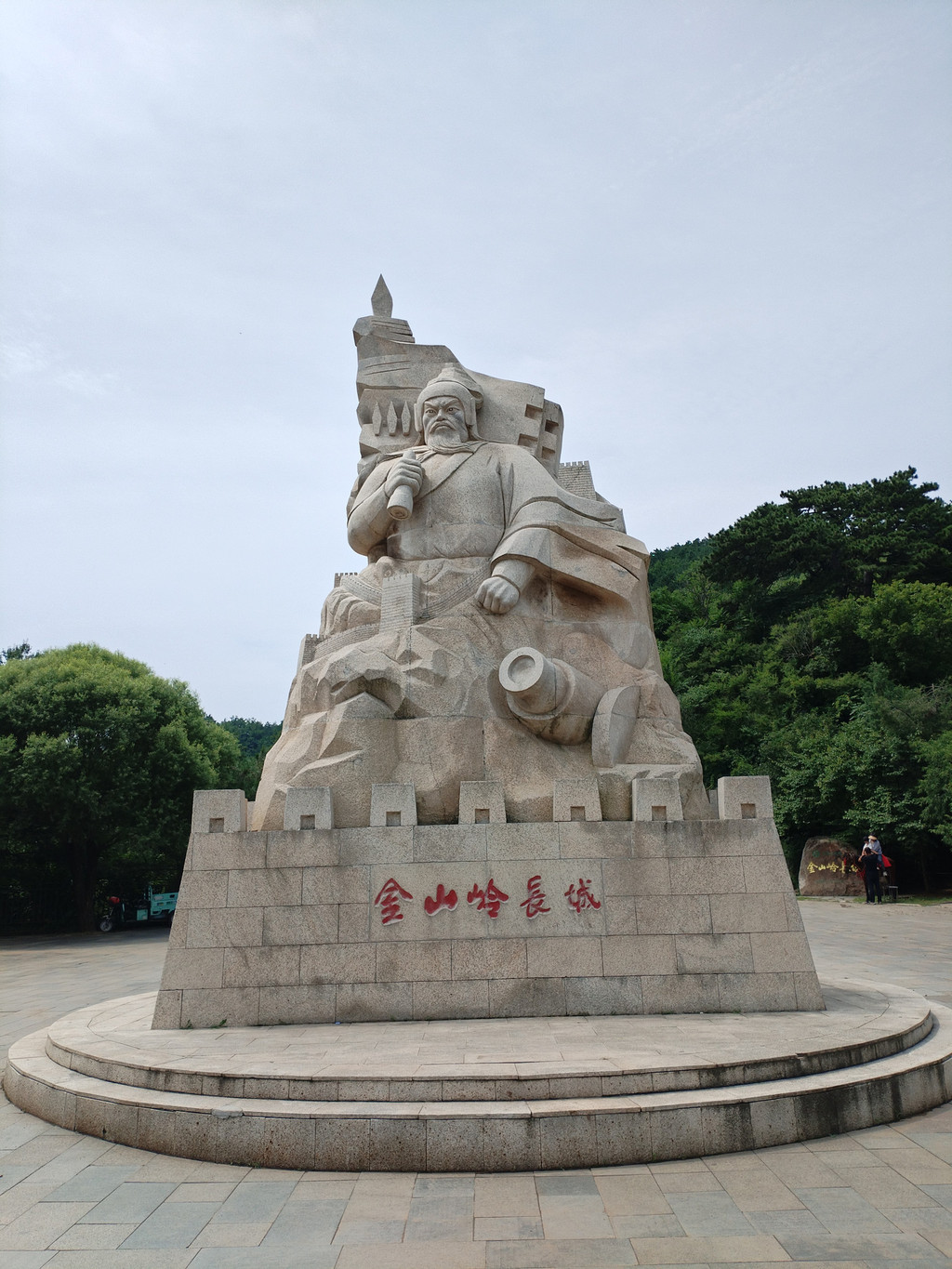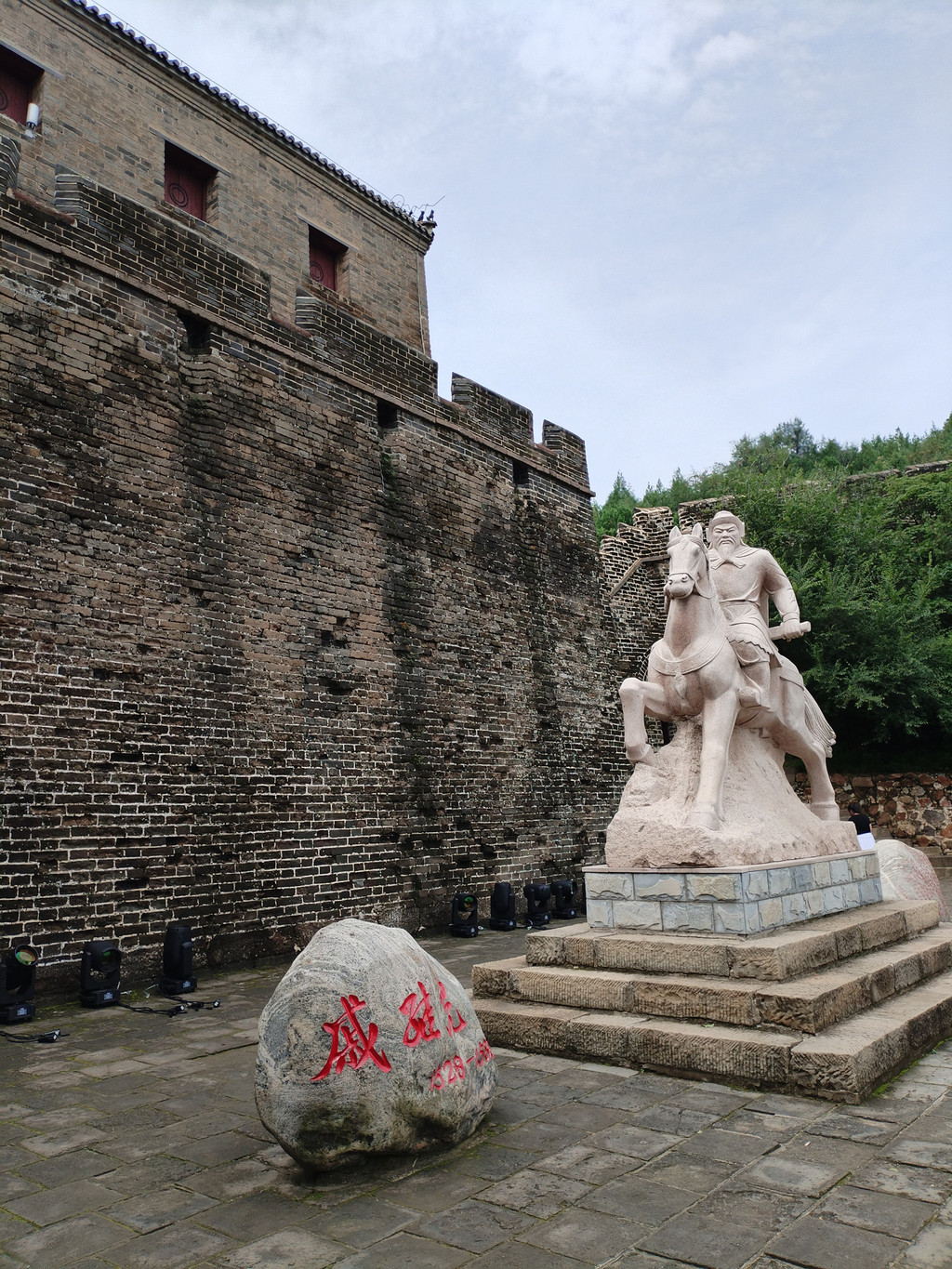 我们是从金山岭长城景区中门进去的。过了检票口,阿李就看见一座高大的戚继光塑像挺立在广场上:一身戎装的戚继光站在写有“金山岭”三字的长城上,身旁是一门大炮;他一手握拳,一手拿着望远镜,凝视着北方。等我们爬到长城入口砖垛口时,关口前面的平台上,一座戚继光骑在马上的塑像又出现在我们眼前。阿李想起今年五月环游福建时,在泉州惠安崇武半岛上的崇武古城,也看到一尊高大的戚继光石像挺立在海边,凝视着东方茫茫大海。看来,南方和北方的人民,都没有忘记当年抗击倭寇、保家卫国的戚继光将军。