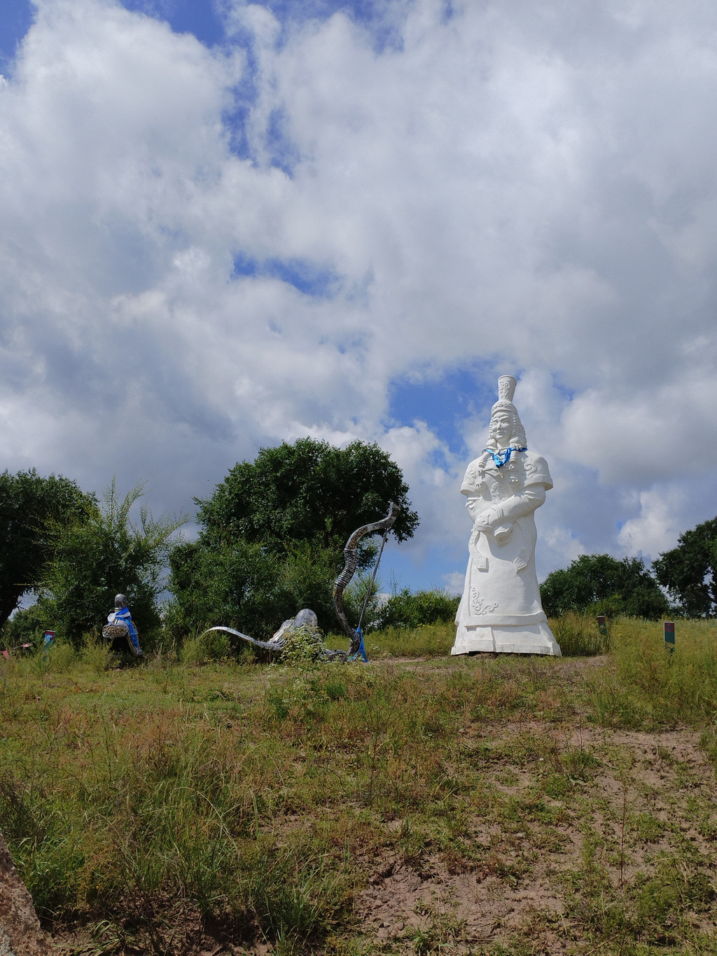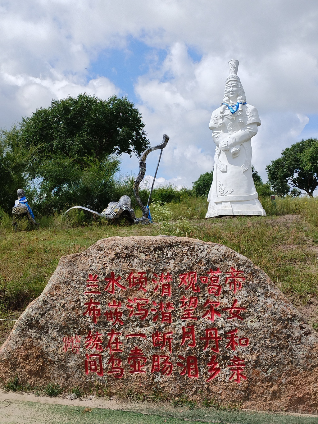 现在,人们在公主湖旁,立了一尊公主站立远眺的汉白玉塑像。塑像旁边有一张弓、一马鞍、一头盔;塑像前面还有一块石头,上面刻有一首诗:帝女和亲噶尔丹,乡观望月泪潸潸。断肠倾泻一壶水,嵌在乌兰布统间。