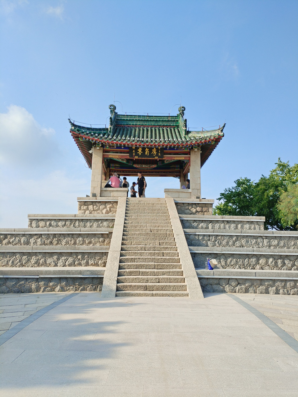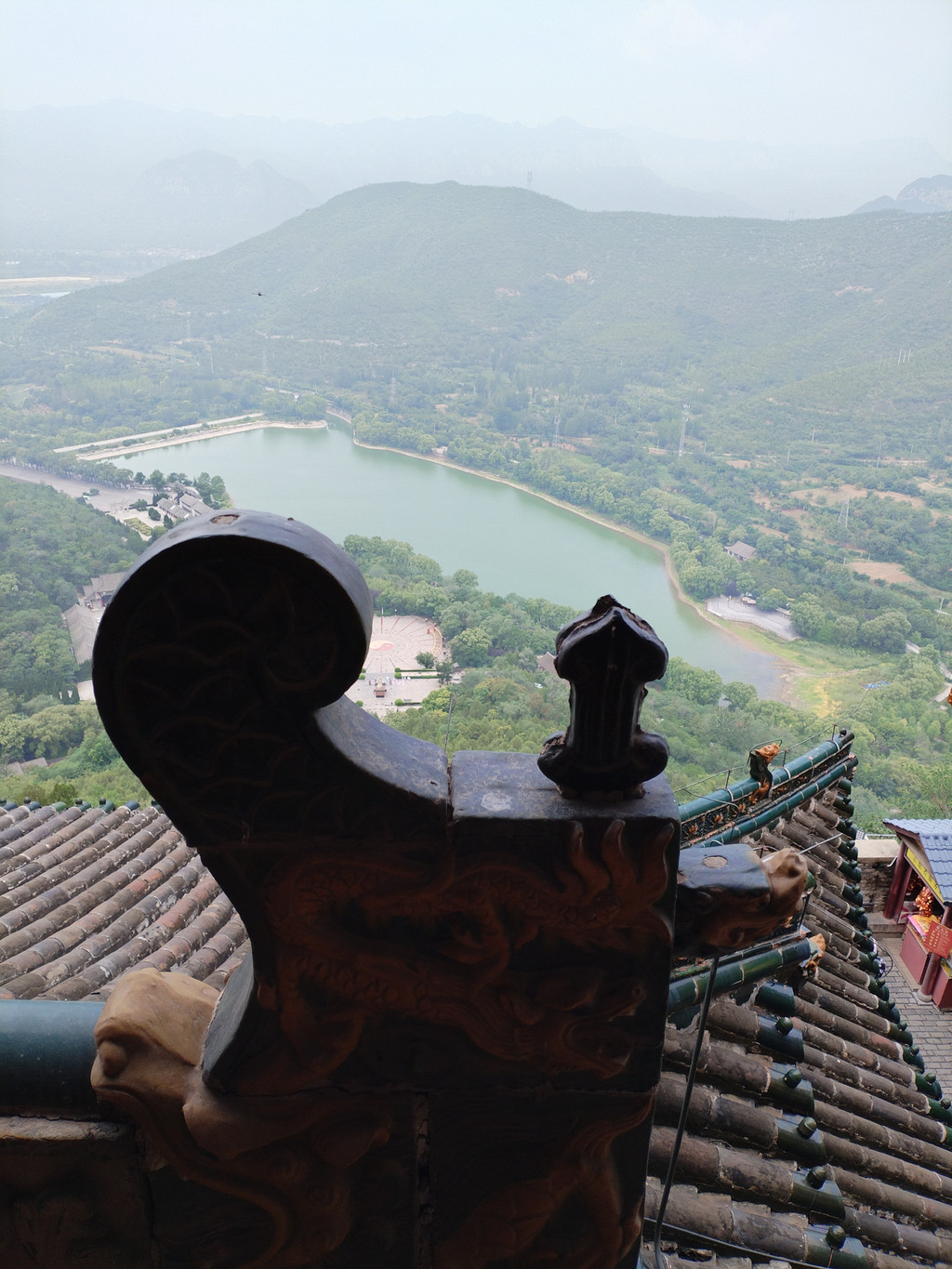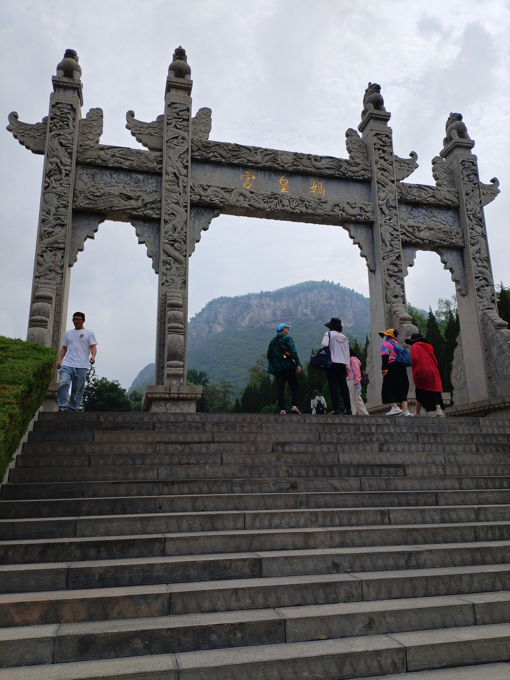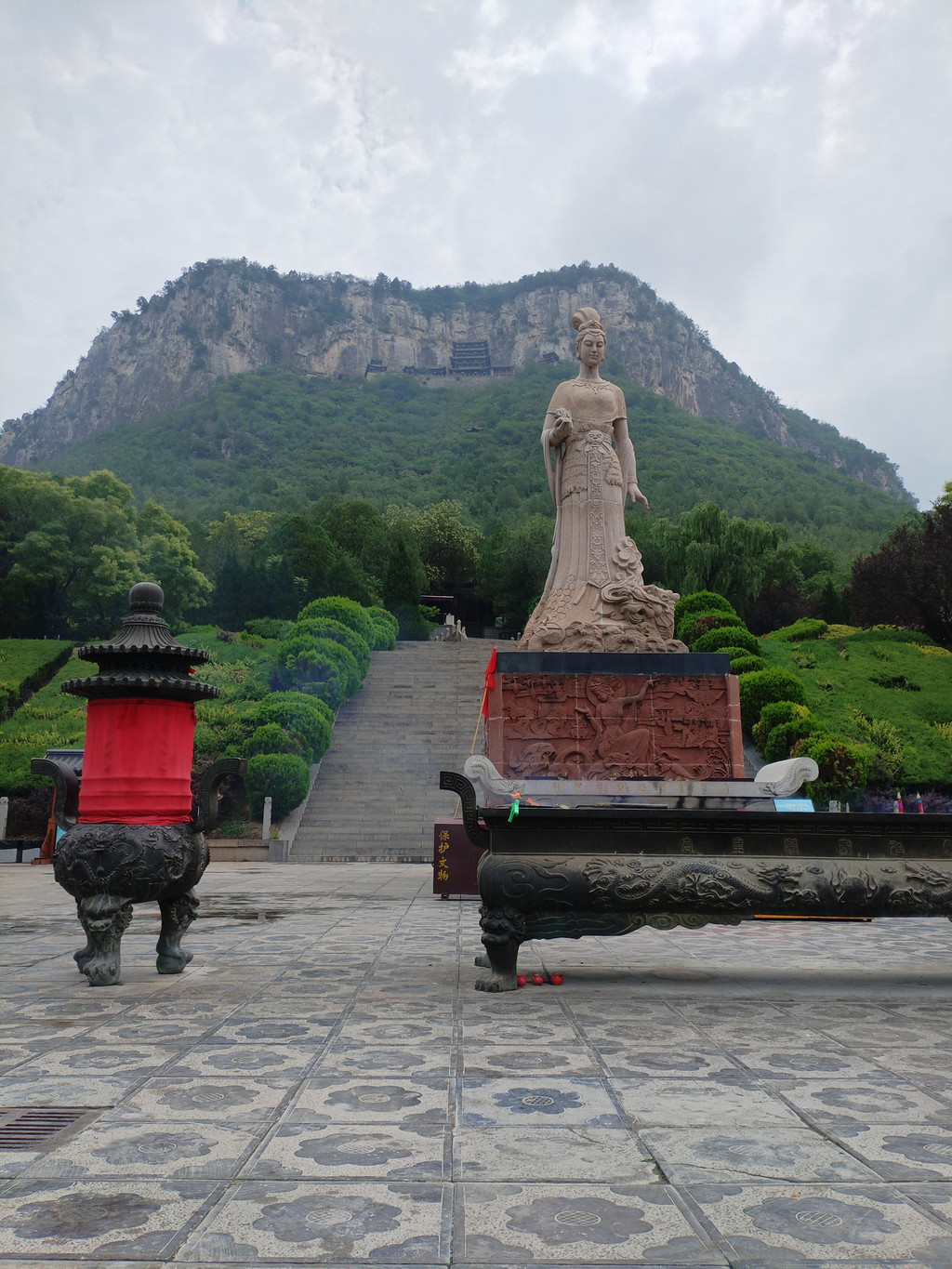 我们进入景区后,走过十八盘山道,走过朝元宫、停骖宫、广生宫,到达开阔的补天广场。补天广场上有一尊九米高的女娲汉白玉塑像——塑像面对着碧绿的补天湖,背对着中皇山上的娲皇阁。我们走过补天广场,开始沿着之字形山路登山,朝着娲皇阁进发。