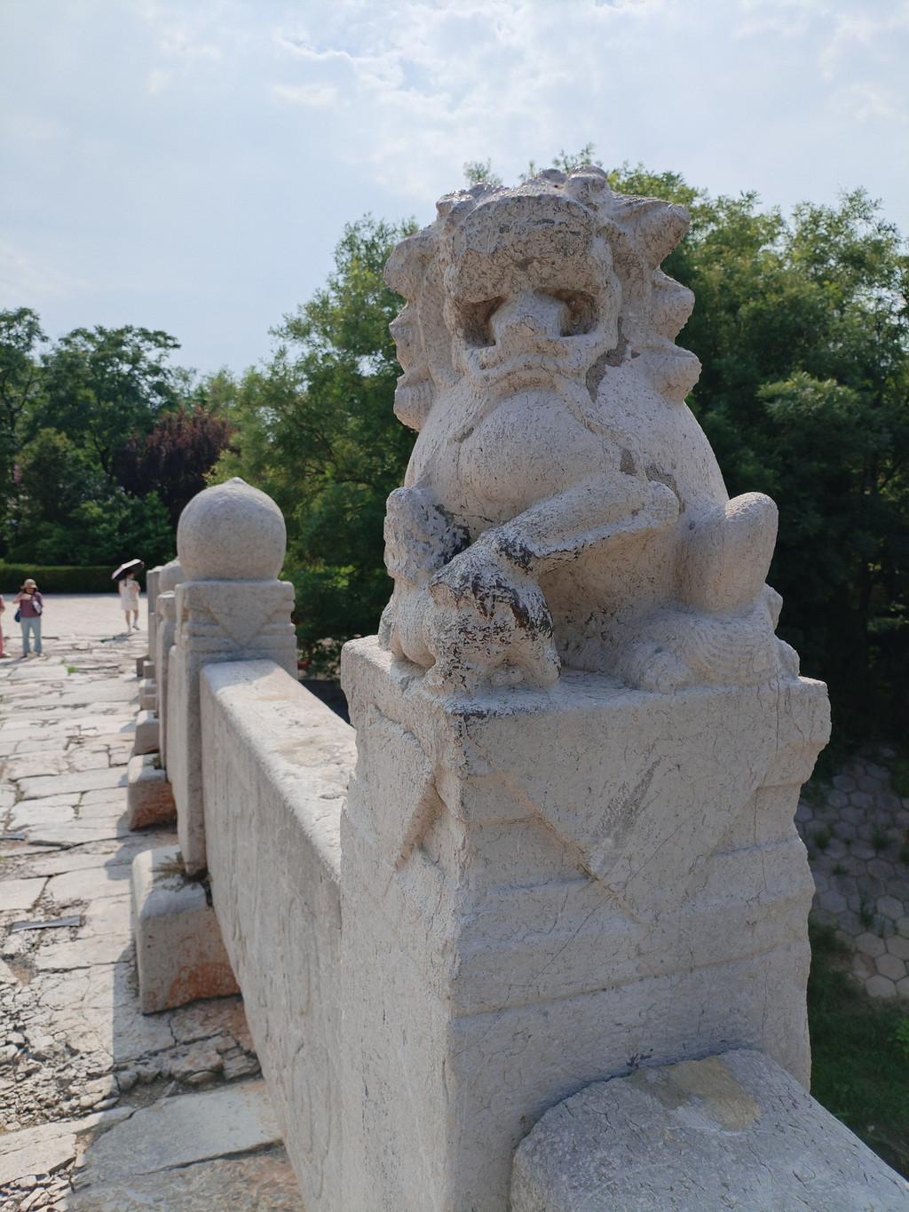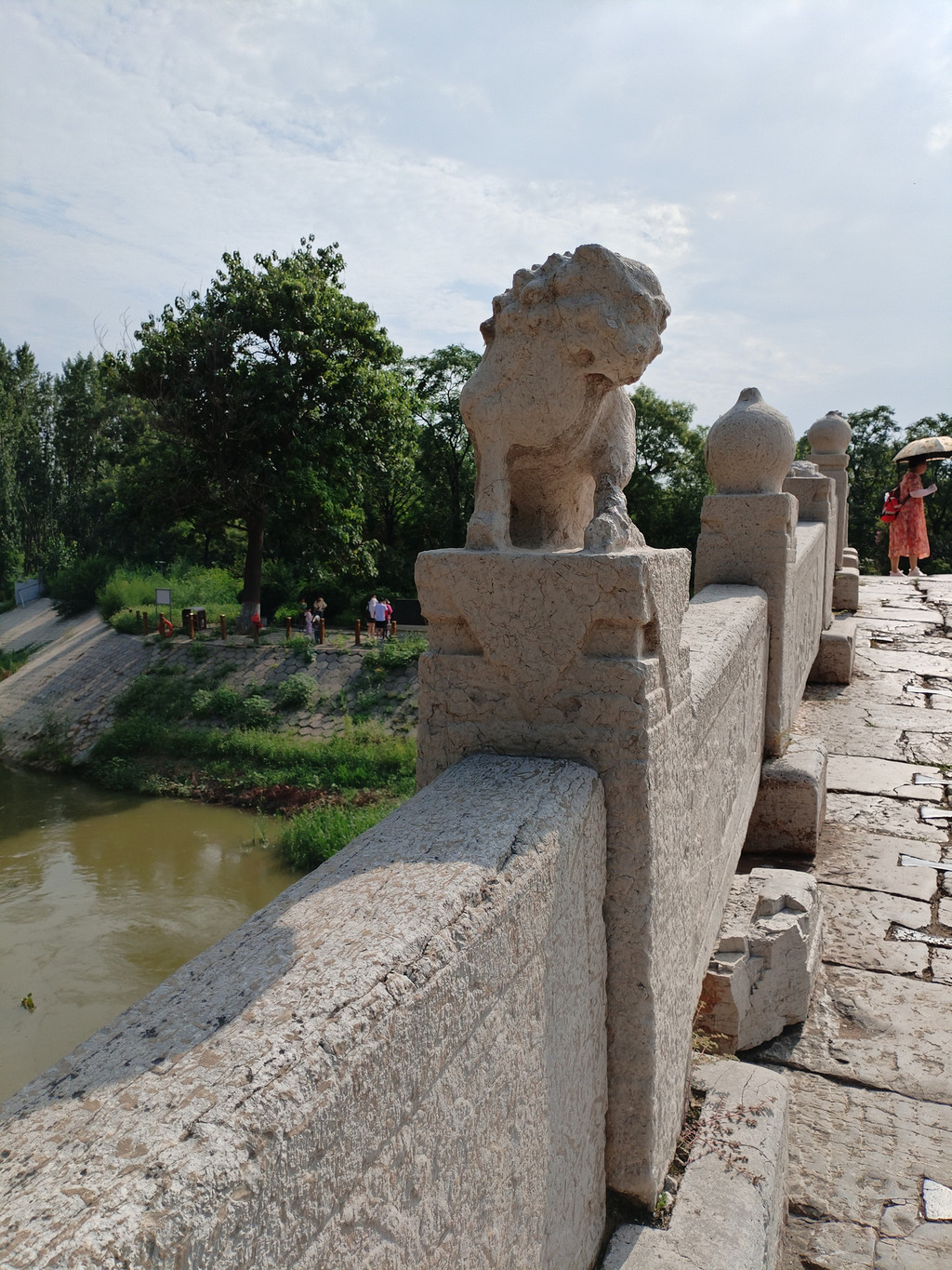 阿李第一次听说赵州桥还有座姊妹桥,很有些好奇。等到走近,发现弘济桥的的外形,和阿李脑海中残存的赵州桥形象完全相同。我们走上弘济桥,感觉到它的古老:石块铺成的桥面并不平整,有些坑坑洼洼;部分桥面还塌陷了,相邻的两块石头上还用铁条连接着。桥两边的栏板内侧,雕有虎、鹿、麒麟、花饰及民间典故等图案。望柱顶端则有狮子、猴子、桃子、石榴等石雕——这些雕刻都十分精美,只是有些雕刻被毁坏了。