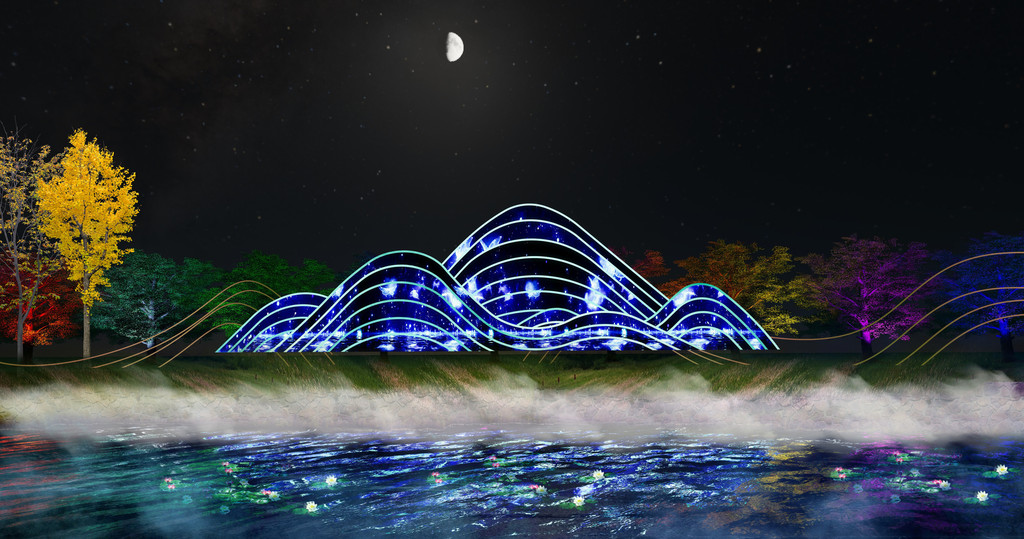 《淇水风华》是一个户外行进式夜游产品,包括陆行和水行两条动线。陆行动线结合双IP角色(鹤小淇、鹤小沬)梦游玄境的故事展开在东门和北门广场,后续行进过程中,游客还可感受幻光森林灯光艺术小品,互动光影装置等丰富多彩的夜游内容。水行动线则是以观澜码头为出发点演艺岛为终点,打造而成的水上漫游式夜游产品。