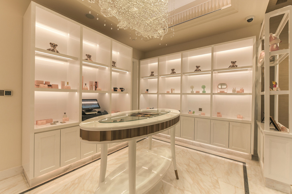 在进入大厅后的左手方向可以看到一个犹如女士首饰盒的橱窗商店,这是酒店品牌中朗廷精品商店。其中商品囊括朗廷品牌专属玫瑰香氛、姜花香薰、朗廷英伦小熊、本地纪念品及英伦风充电器等。