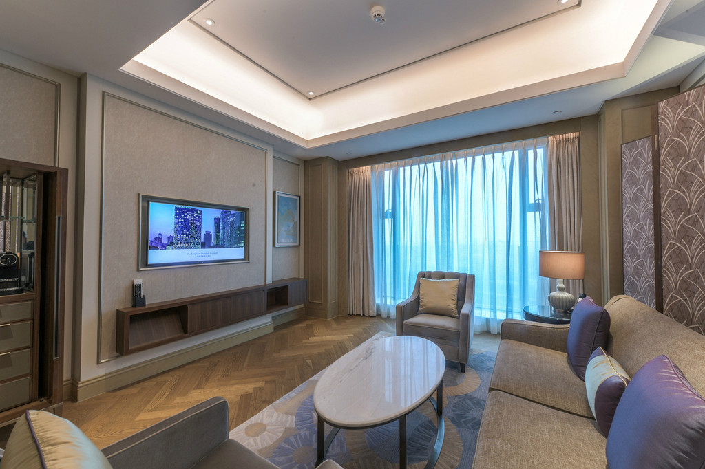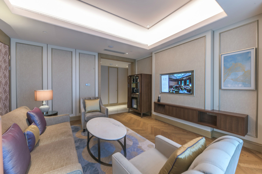 现在就来看看山野君下榻的朗廷客房的环境,我选择是观景豪华套房。房间是由一个客厅、卧室与浴室三部分组成,倚靠在床边眺望视野开阔,城市醉人景致尽收眼底。套房布局规整,一客一卧两卫,客厅装修颇有英国会客厅的风范,具有艺术气息的屏风装点出别具一格的质感。双迷你吧设计,方便您在会客厅或卧房内自由使用。