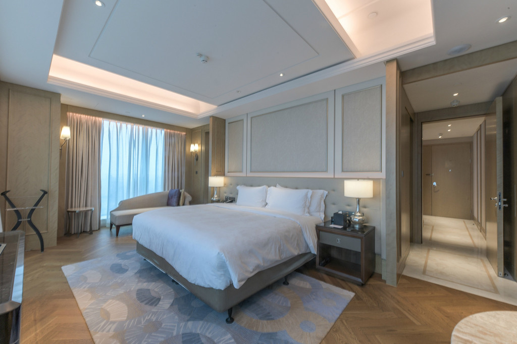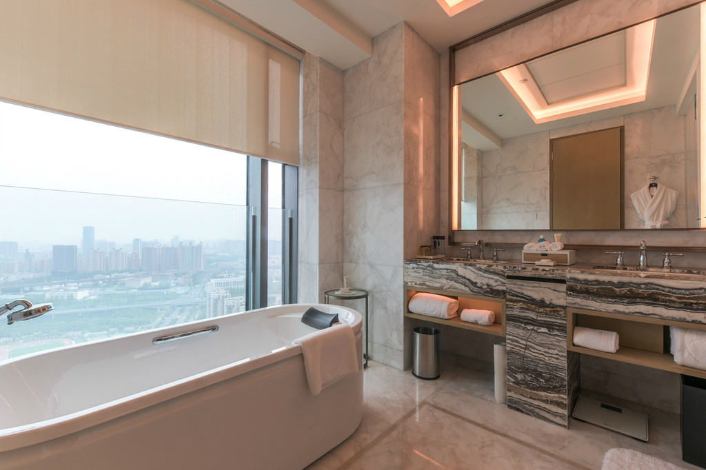 静夜睡床Blissful Bed亦是卧室的一大亮点,酒店选用全球第一的丝涟Sealy床垫,其高级密度优质舒适垫料,根据人体需要调节表面温度的智爽面料以及健康除螨的益生菌面料,有效地给予身体不同部位压力 舒缓,同时减少睡伴间的干扰,确保整晚优质的睡眠体验。自由控制的浴室调光玻璃,让你拥有两种不同的视觉感受。洗手间选用了大理石做台面,典雅而奢华。