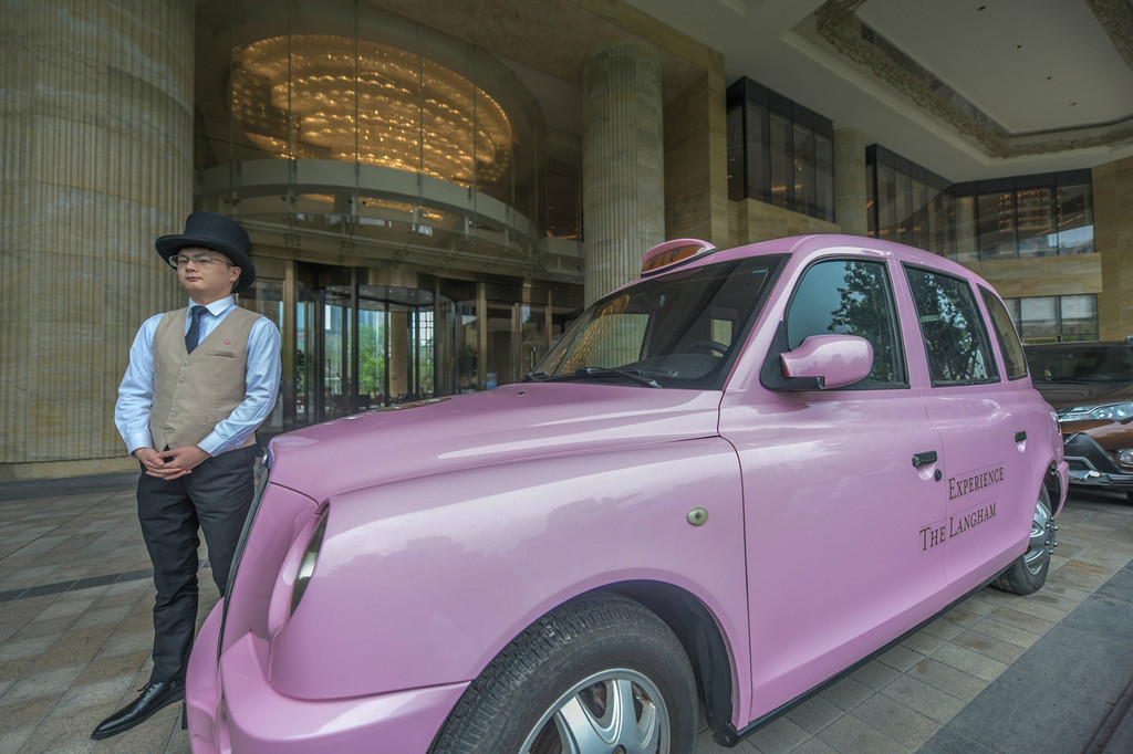 加上正门口花园欧式喷泉景观和每一家朗廷酒店门口都会停放的朗廷“小粉车“,艺术审美更让人过目不忘,英伦燕尾服高礼帽的礼宾接待更是让人忍不住马上探究这家朗廷的内在奢华体验。