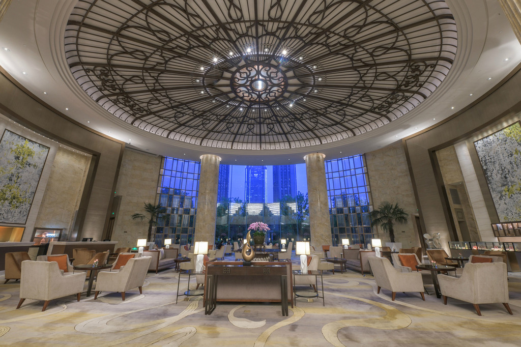 酒店大堂空间感十足,整体意大利进口的乳白色大理石和金属格调欧洲宫廷贵族的气息浓郁,随处可见的艺术品及油画装饰,让这家酒店在气场上就赋予了合肥地标性酒店也是最奢华酒店的称呼。大堂内部光线亮度均匀饱和、光比不大,属于典型的轻奢类型的装修风格,作为喜欢建筑的山野君,对于这样的装修环境趋之若鹜。