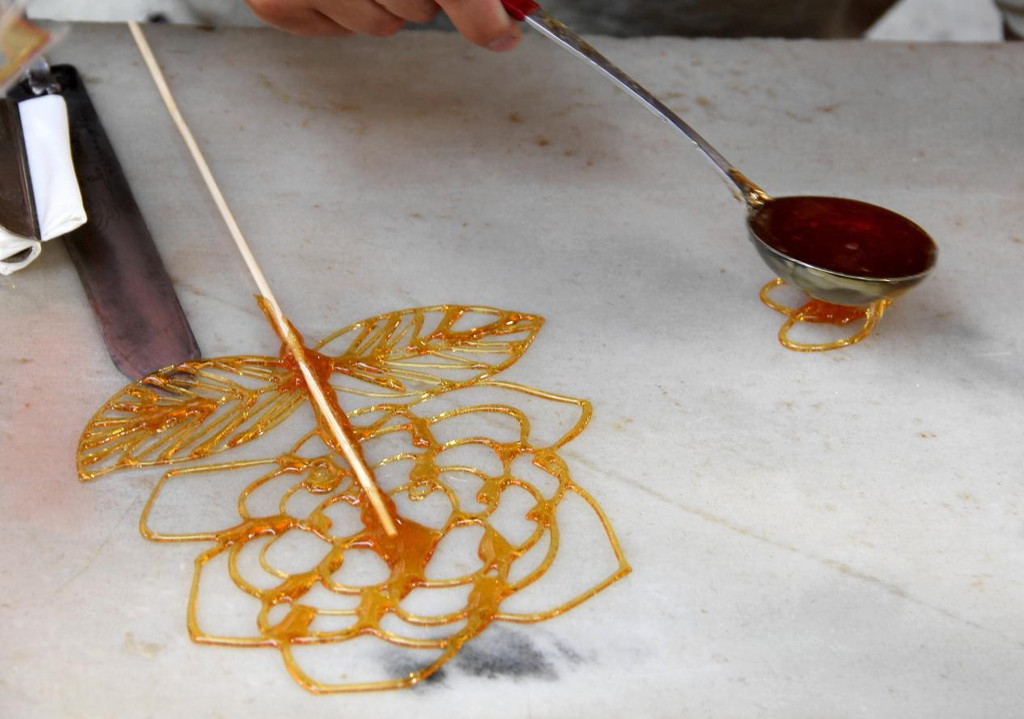 路过回忆里甜甜的糖画摊,怎么能放过,拜托师傅帮我做个栀子花模样的糖画,和朋友一起边吃边走,开心一整天。