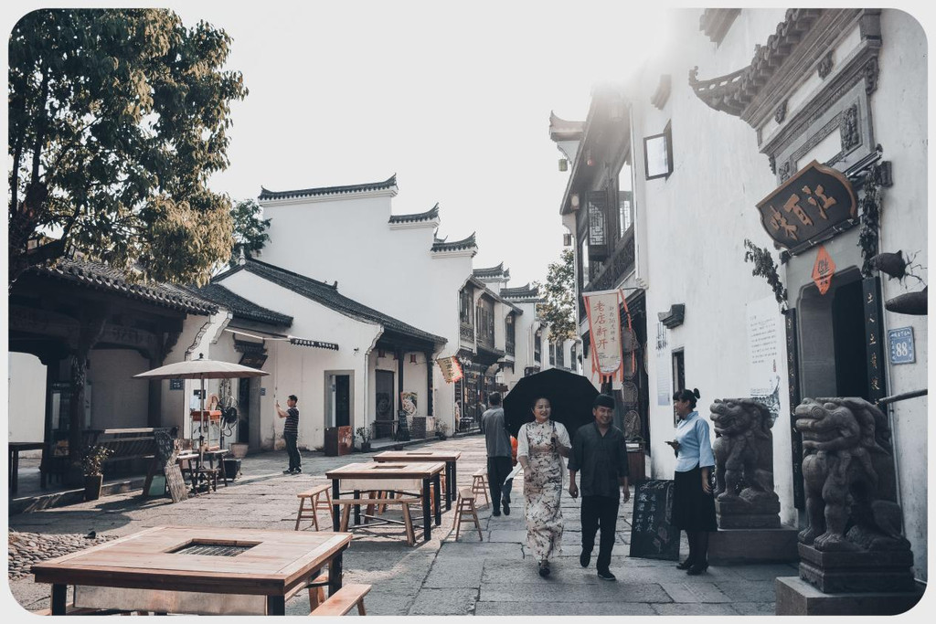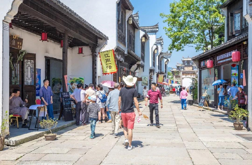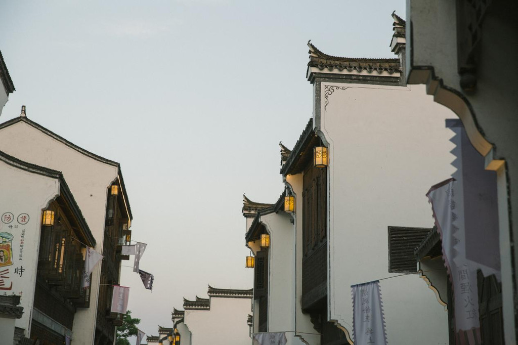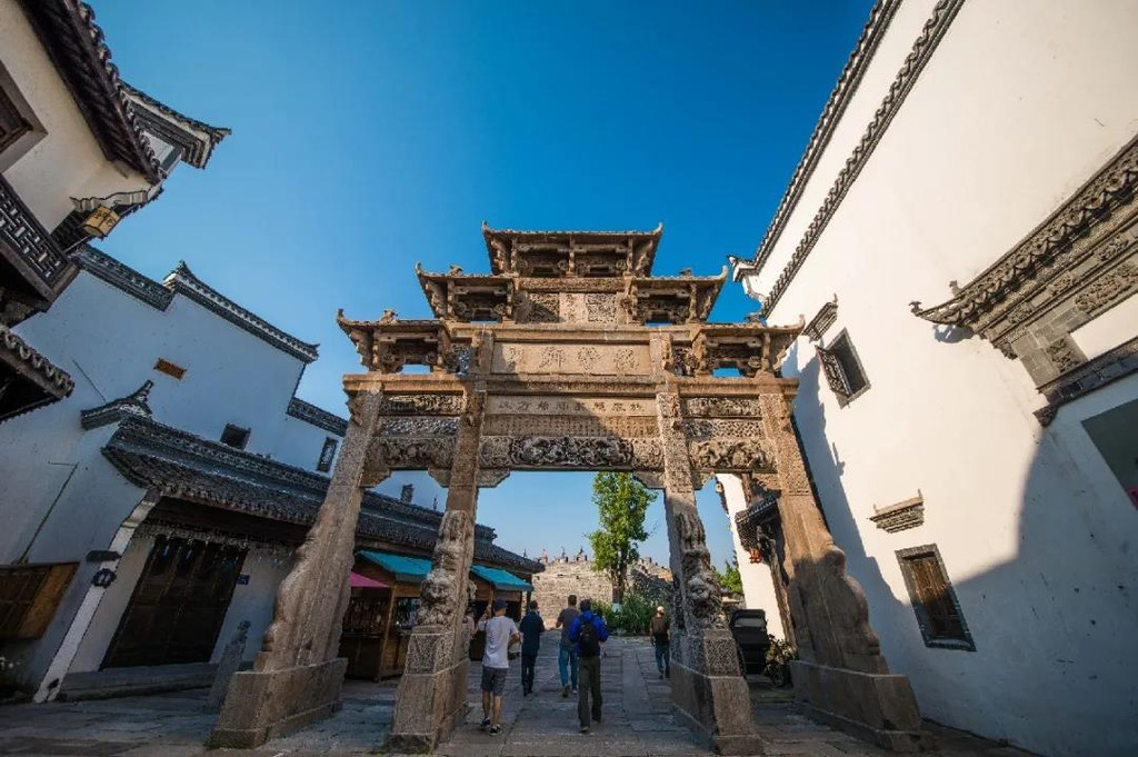 这里没有大都市的喧哗、嘈杂和沉闷, 老街不宽,两边均是青砖灰瓦的徽派建筑风格。飞檐翘角、木镂花窗,经过人工改造仿古,与屋顶的青瓦浑然一体,全长666米的悠长的仿古老街上,青石板路、旧门板、白墙灰瓦,所及之处皆为1400年前的景象,仿佛穿越到了那个真真切切的千年古城狮城之中。