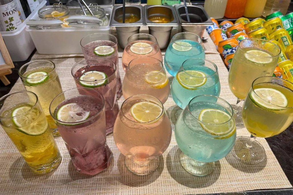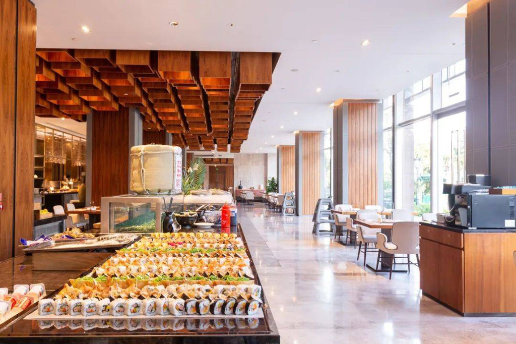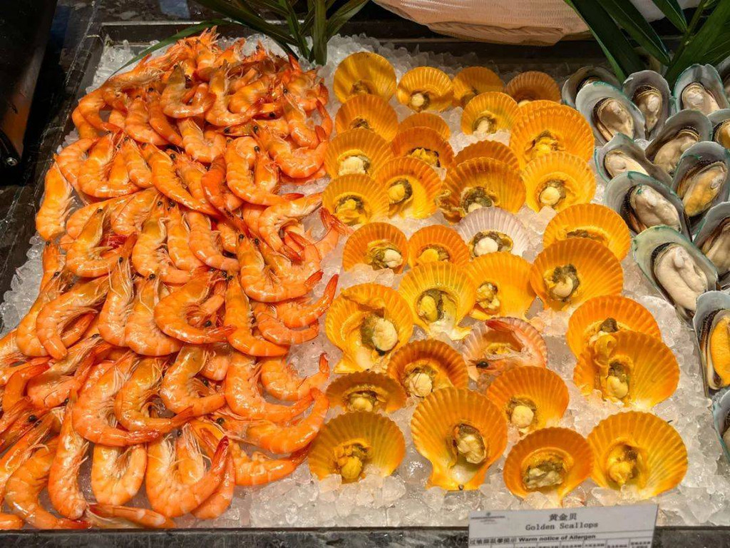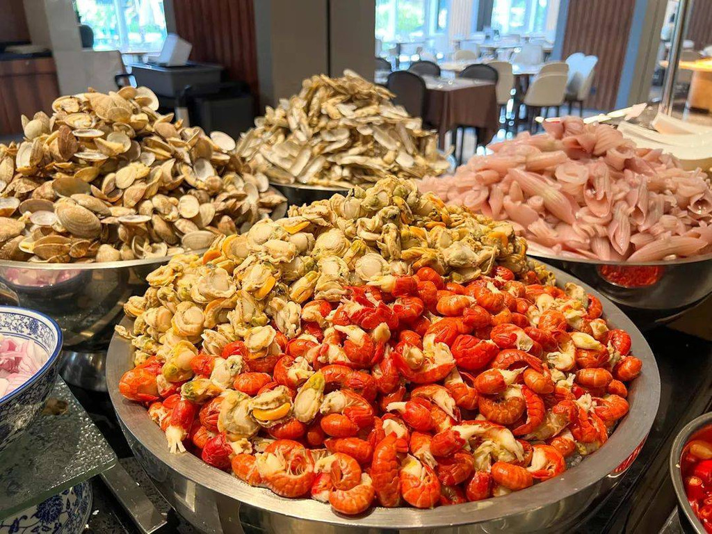 湖畔全日制餐厅的晚餐特别丰盛,各款新鲜的海鲜虾蟹、现烤蒜蓉生蚝、鲜香炒制小海鲜......各类蒸熟待品的各类海鲜;先切的日式刺身,各款口味造型的寿司料理。现场还有可爱的服务小姐姐现场精心调制无酒精鸡尾酒饮品。