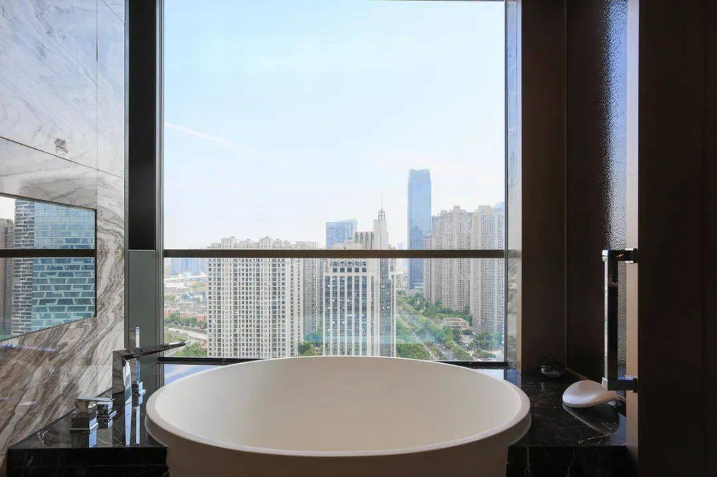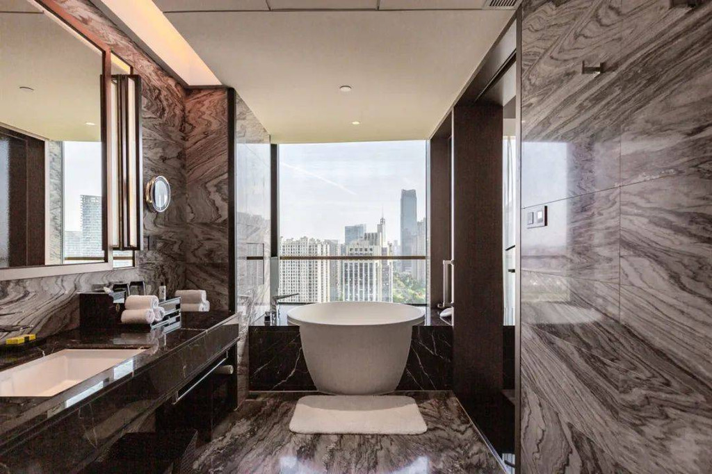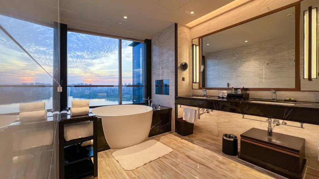 移步至卫浴区域,行政客房的浴缸置于窗边(基础房的浴缸位于入门处),部分房型甚至可以直面天鹅湖湖景。