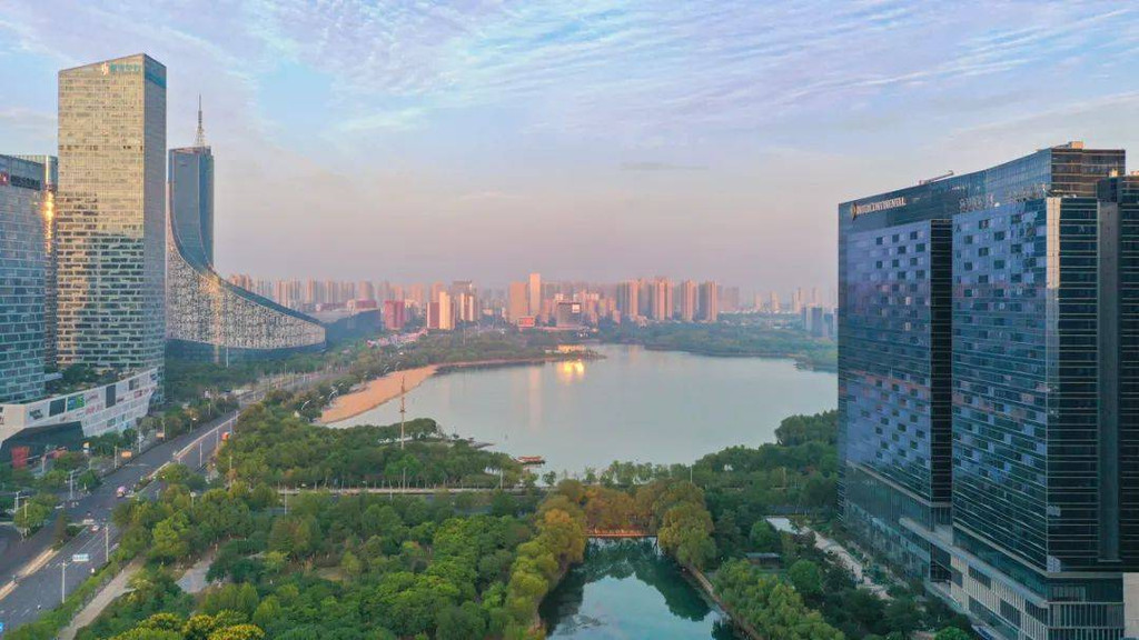 清晨航拍酒店,可清晰看出坐落于美丽的天鹅湖畔,毗邻合肥奥体中心和合肥大剧院,雄踞政务新区商业地带,尽览湖光水色与城市繁华景致,建筑设计新颖大气。