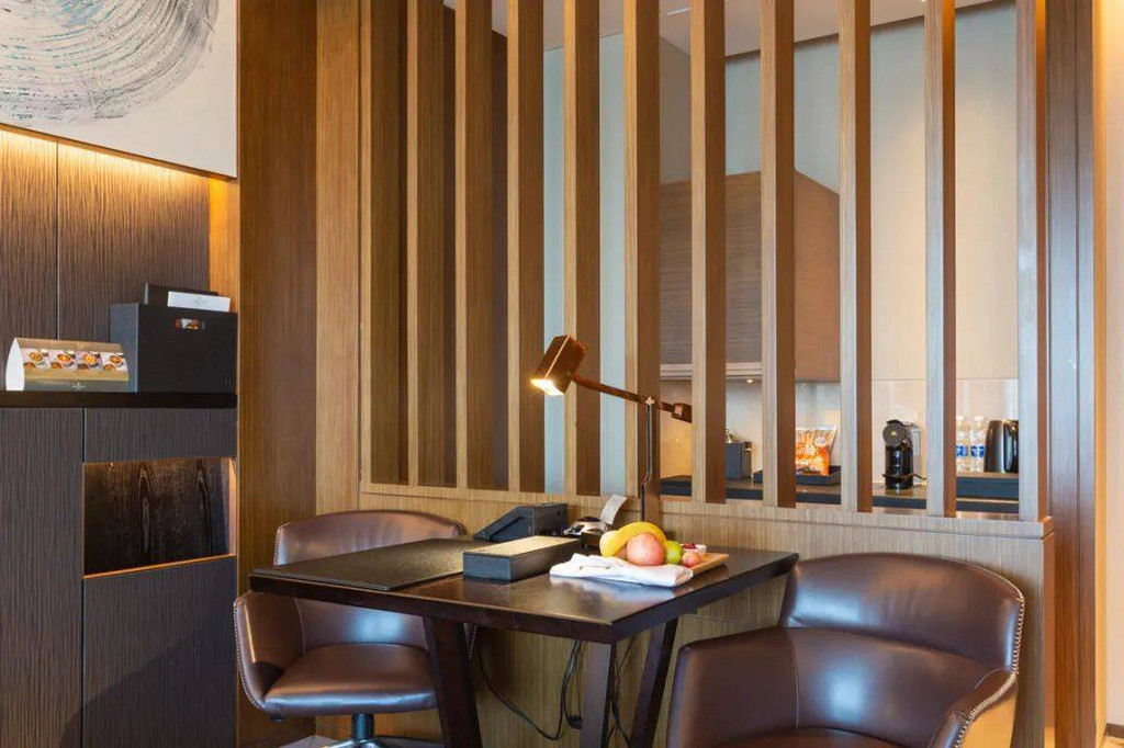 客房的设计也巧妙的融入山河湖水的元素,水蓝色的地毯、墙上水墨写意的山岚气韵、靠垫上充满山水灵气的装饰花纹无不透露出自然意趣。宽大的办公桌更方便了商务客人在此办公。房间还配备有BOSE音响,咖啡机,迷你吧。