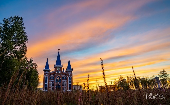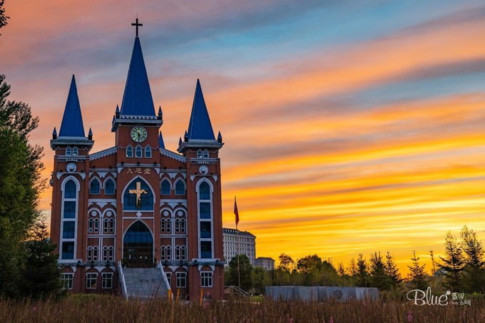 那庄重的红色外墙,还有那蓝色的尖顶,加上背后延伸着的一条条神奇彩带,金黄和蔚蓝的融合又溢出,让人陷入了无限遐想中~心里在想,要是有穿着婚纱的新娘和着燕尾服的新郎在此时入镜,那就真是完美了!